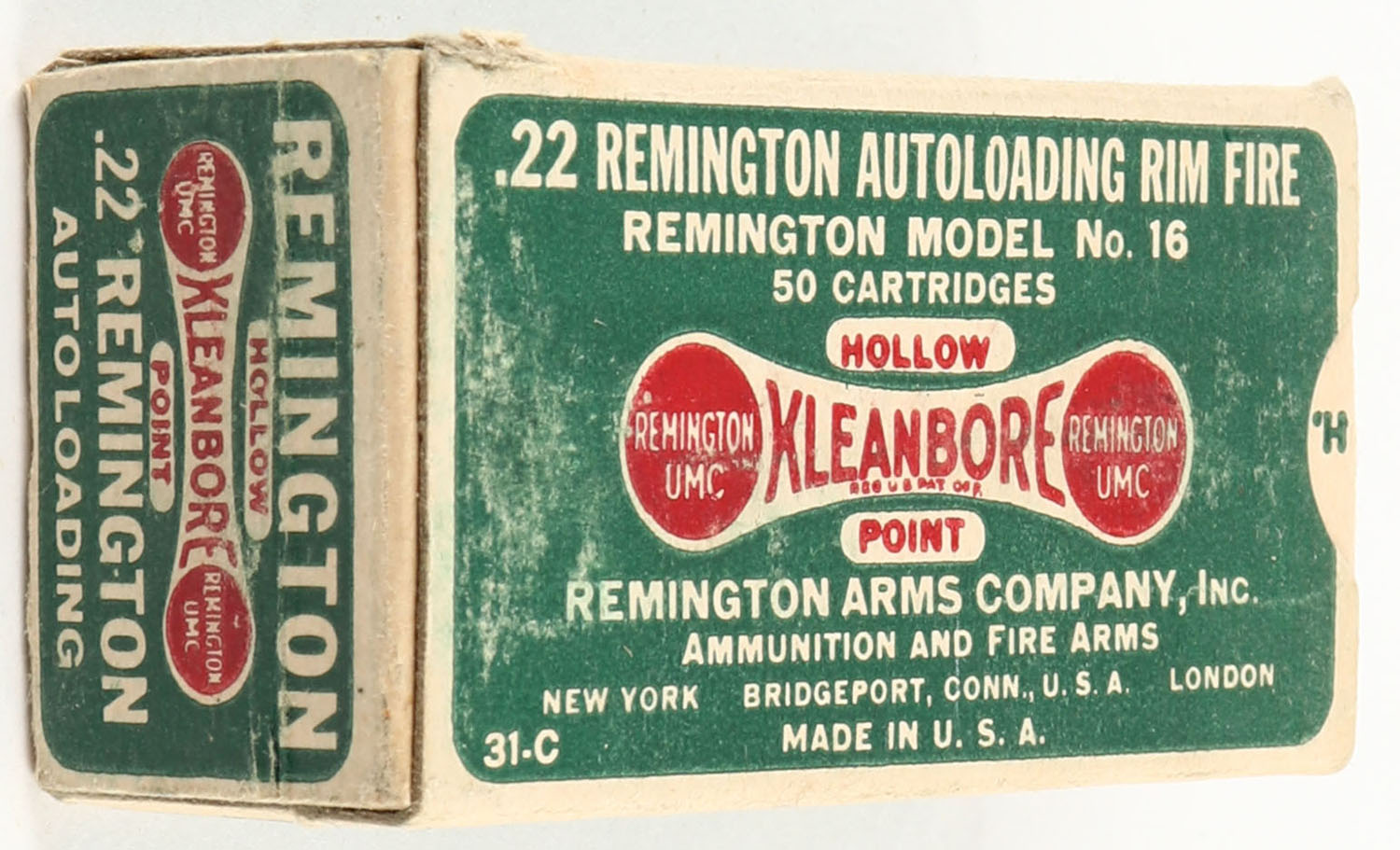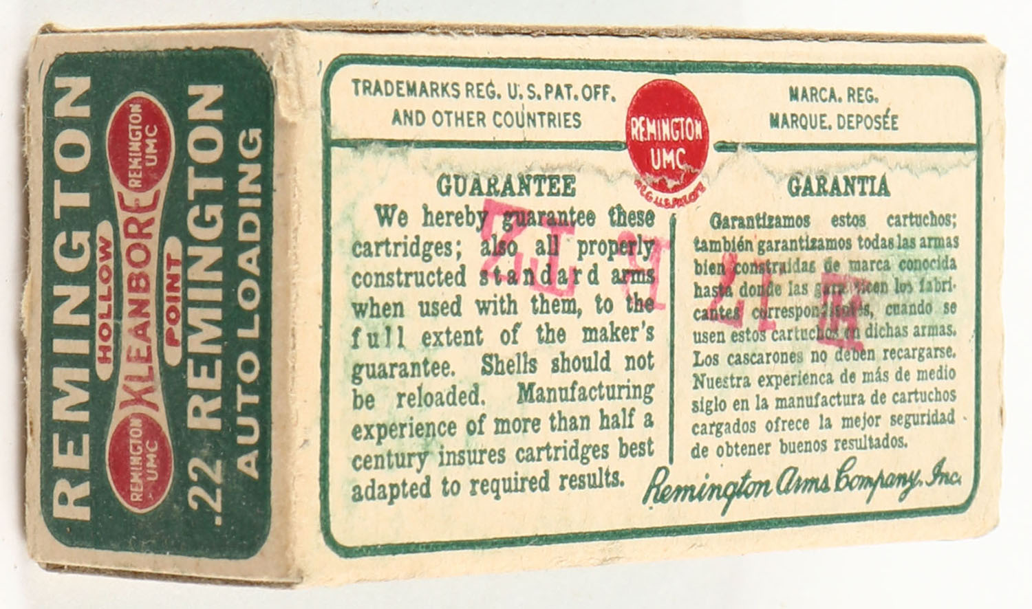 Remington, Kleanbore, .22 Remington Autoloading, RHWeb: REM-7.1A RA-3, Full, 1pc. Green buff & red dog bone box, box is solid with excellent color, minor shelf & corner wear, edges are mostly crisp, end flaps are solid, ammo is excellent. Grade: Excellent + - Value: 50 to 150