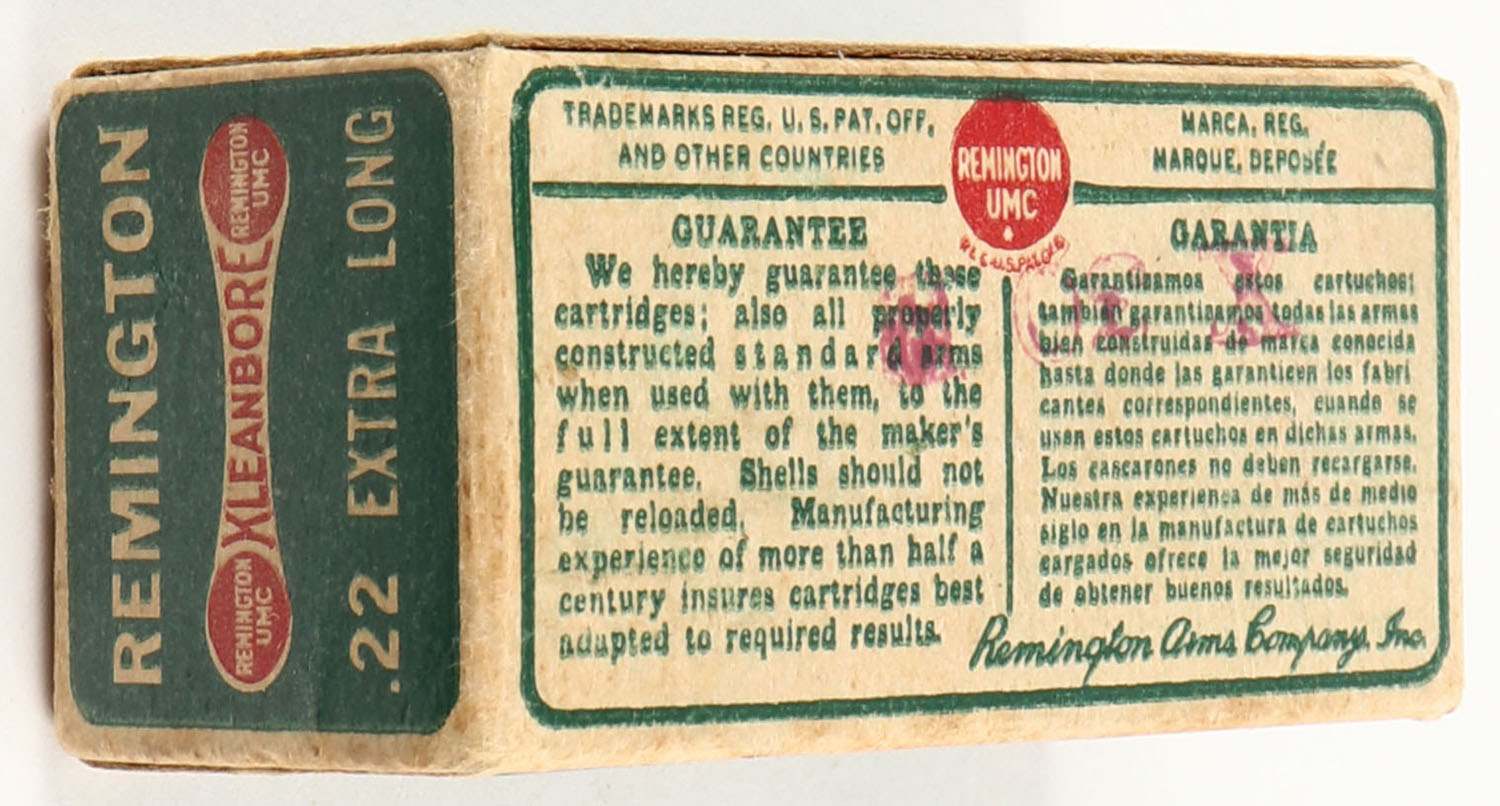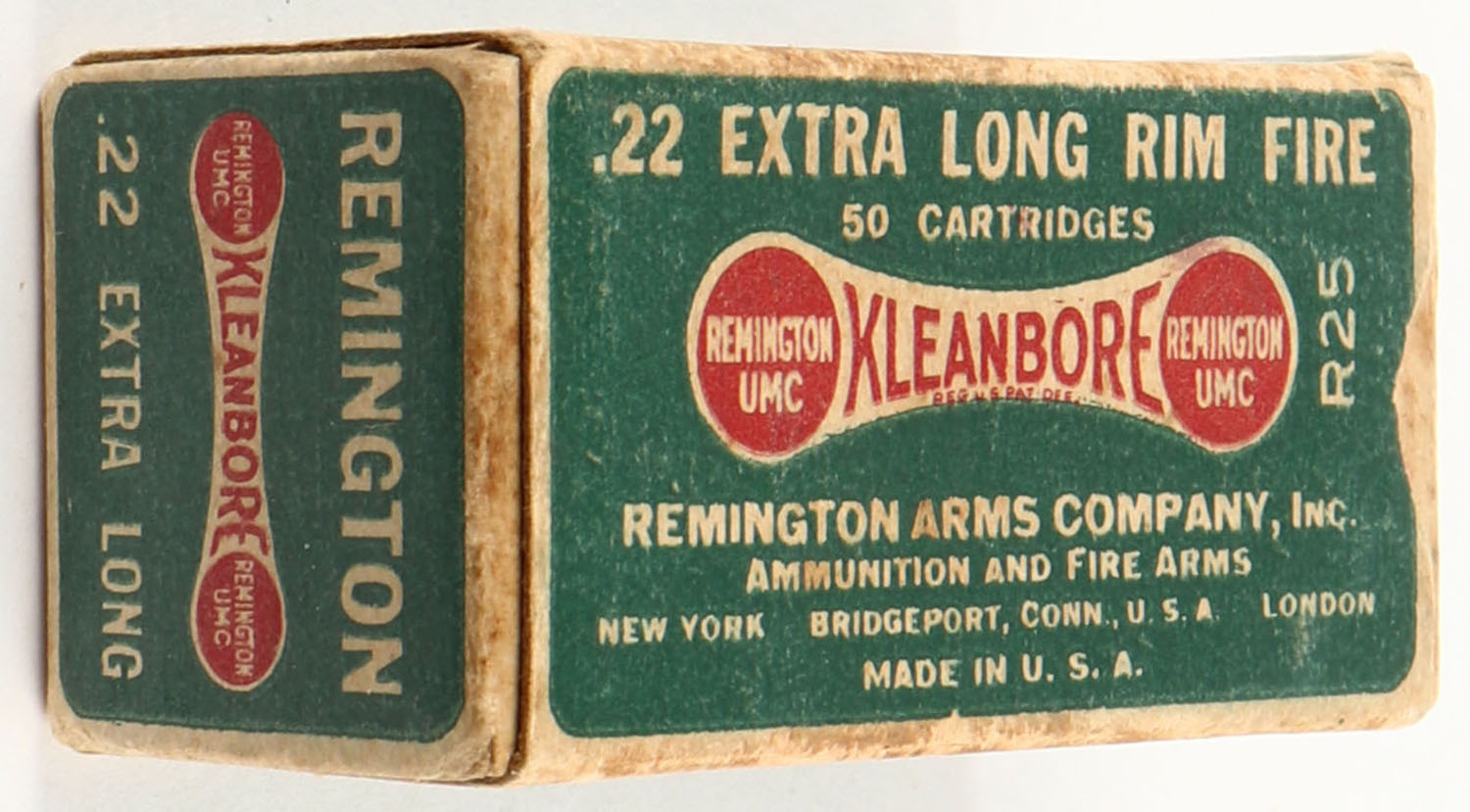 Remington, Kleanbore, .22 Extra Long, RHWeb: REM-7.1B XL-1c, Full, 1pc. Green buff & red dog bone box, box is solid with very good to excellent color, some age soiling, minor edge & corner wear, end flaps are solid, ammo is excellent. Grade: Excellent - Value: 150 to 450