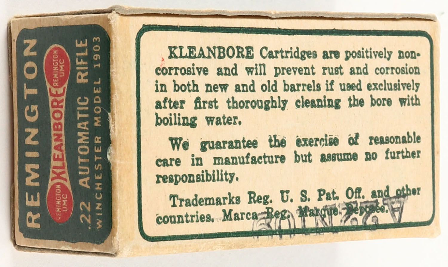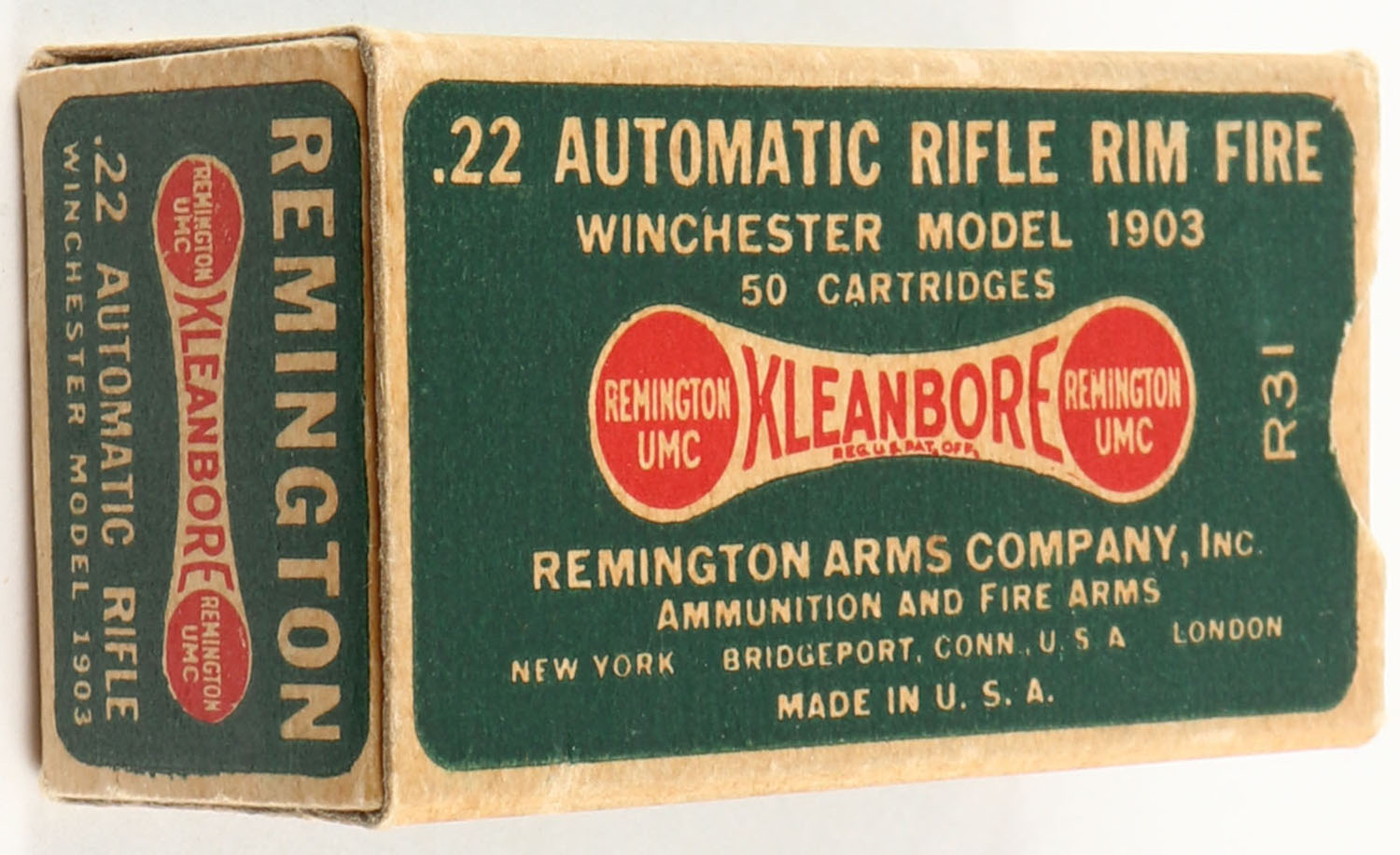 Remington, Kleanbore, .22 Winchester Automatic, RHWeb: REM-7.1B WA-1f, Full, 1pc. Green buff & red dog bone box, box is solid with excellent color, very minor age soiling & corner wear, edges are crisp, end flaps are solid, ammo is excellent. Grade: Excellent + - Value: 16 to 60