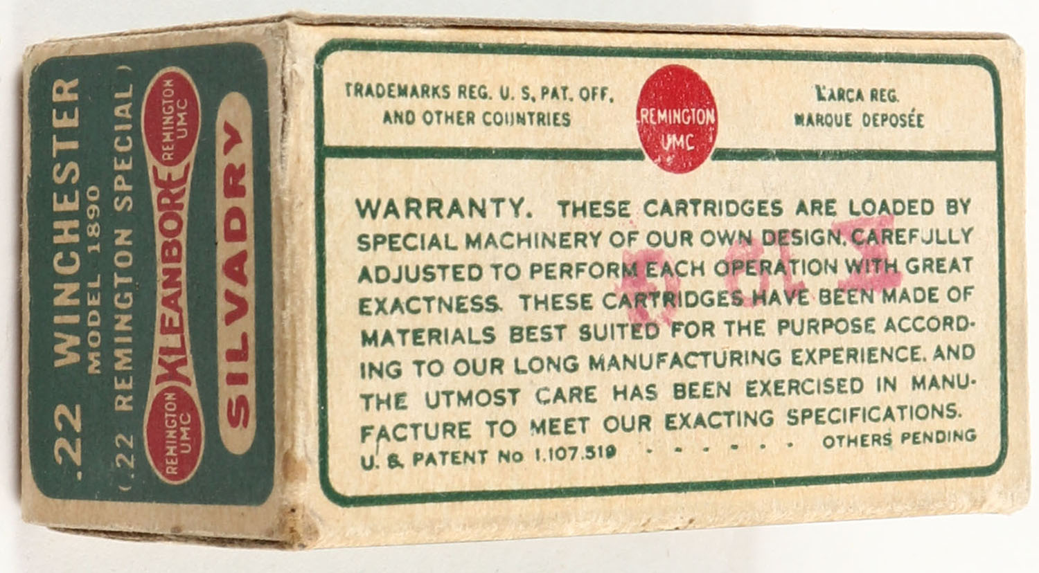 Remington, Silvadry Kleanbore, .22 Winchester (.22 Remington Special), inside lubricated, RHWeb: REM-7.3 WRF-1a, Full, 1pc. Green buff & red dog bone box, box is solid with excellent color, very minor corner wear, edges are crisp, end flaps are solid, ammo is excellent. Grade: Excellent + - Value: 60 to 240