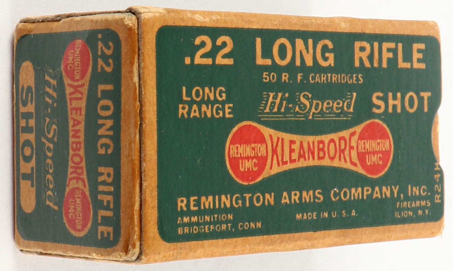 Remington, Hi-Speed Kleanbore, .22 Long Rifle Shot, RHWeb: REM-7.4 LR-4c, Full, 1pc. Green buff & red dog bone box, box is solid with very good to excellent color, minor age soiling, some corner wear, edges are crisp, end flaps are solid, ammo is excellent. Grade: Excellent - Value: 10 to 50