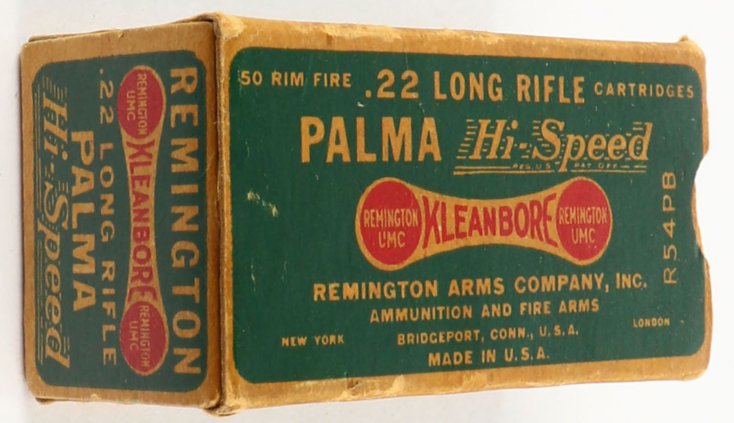 Remington, Palma Hi-Speed Kleanbore, .22 Long Rifle, RHWeb: REM-52 LR-12b, Full, 1pc. Green buff & red dog bone box, missing right end flap is torn, insert tab of right end flap is torn, very good color, some age soiling, minor edge & corner wear, left end flap is solid, ammo is excellent. Grade: Good ++ - Value: 4 to 20