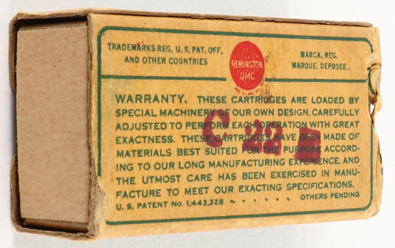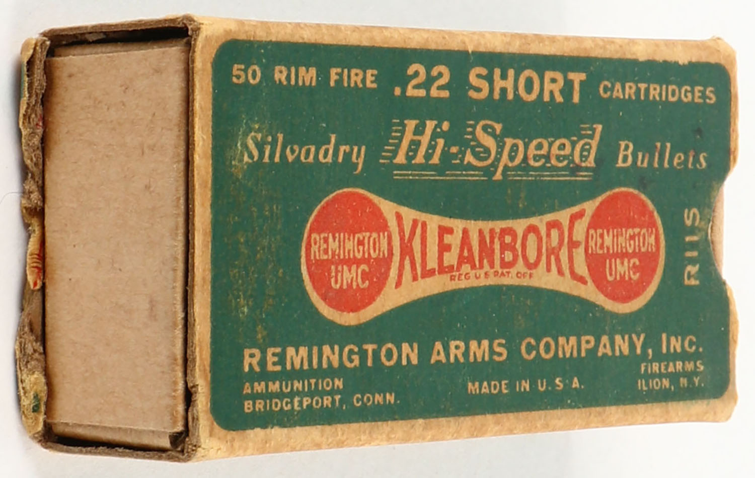 Remington, Silvadry Hi-Speed Kleanbore, .22 Short, RHWeb: REM-7.5 S-1(?), Partial 21rds., 1pc. Green buff & red dog bone box, box is missing both end flaps, very good color, age soiling, minor shelf & corner wear, edges are crisp, ammo is excellent. Grade: Good - Value: 2 to 20