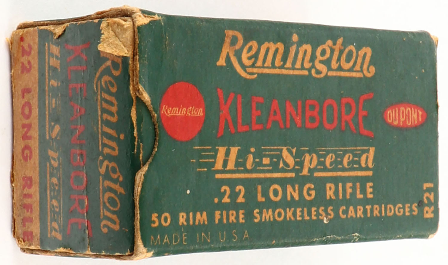 Remington, Kleanbore Hi-Speed, .22 Long Rifle, RHWeb: REM-10 LR-1b, Full, 1pc. Green buff & red box, box is solid with very good color, some age soiling & corner wear, very minor edge wear, end flaps are solid, ammo is excellent. Grade: Excellent - Value: 6 to 30