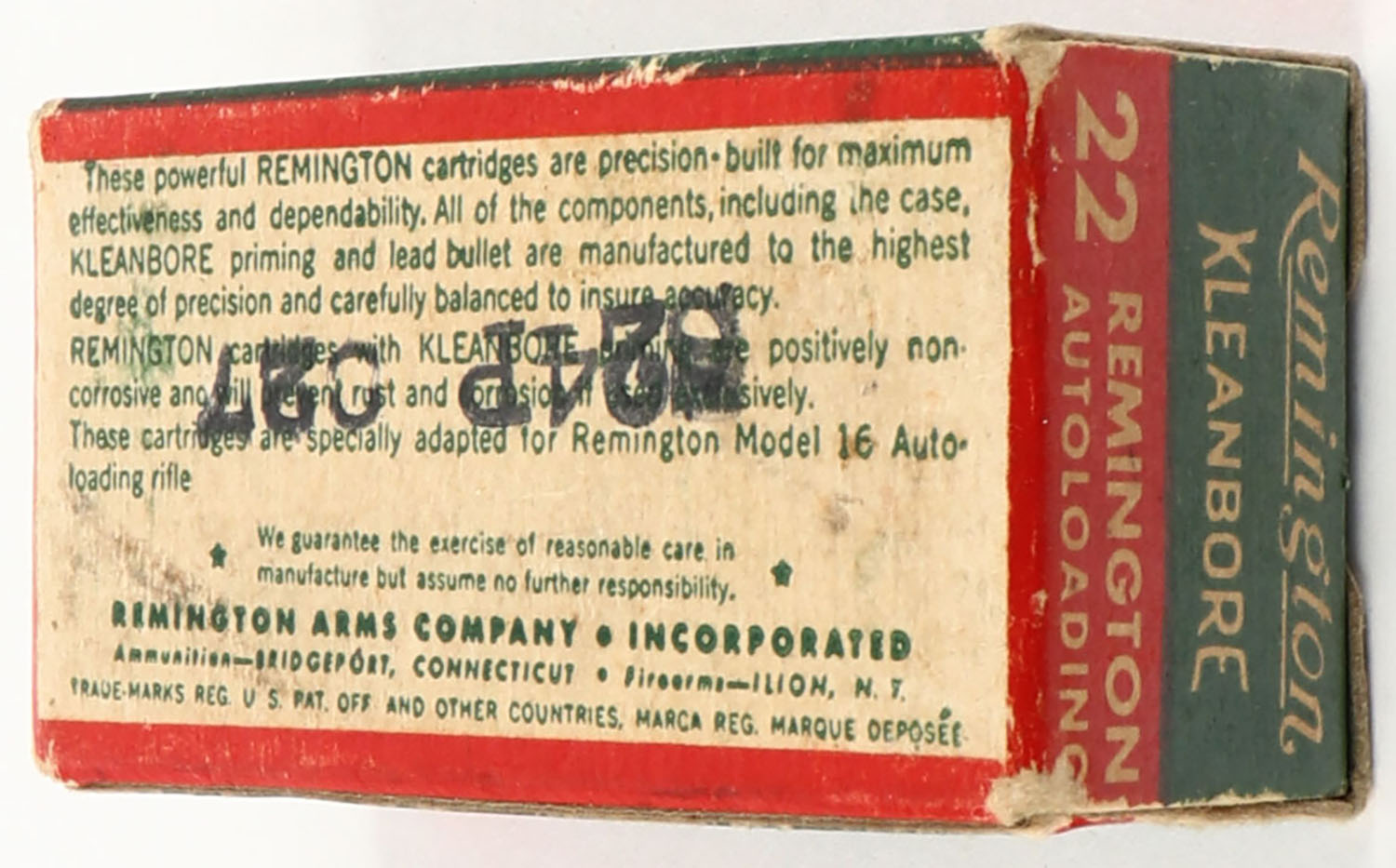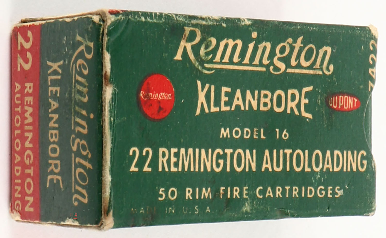 Remington, Kleanbore, .22 Remington Autoloading, RHWeb: REM-12 RA-1b, Full, 1pc. Green buff & red box, box is solid with excellent color, minor age soiling & shelf wear, minor corner wear, very minor edge wear, end flaps are solid, ammo is excellent. Grade: Very Good ++ - Value: 50 to 150