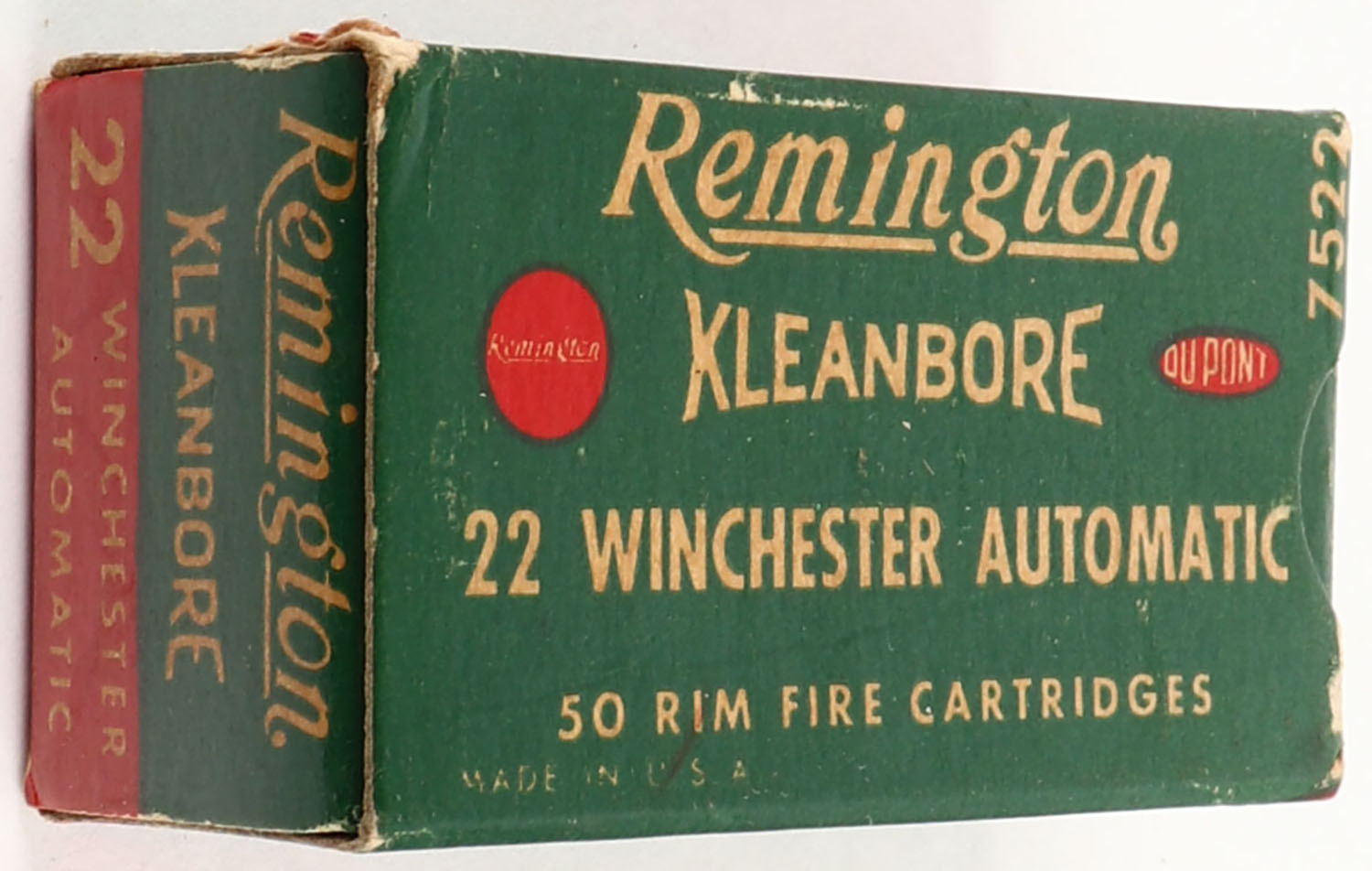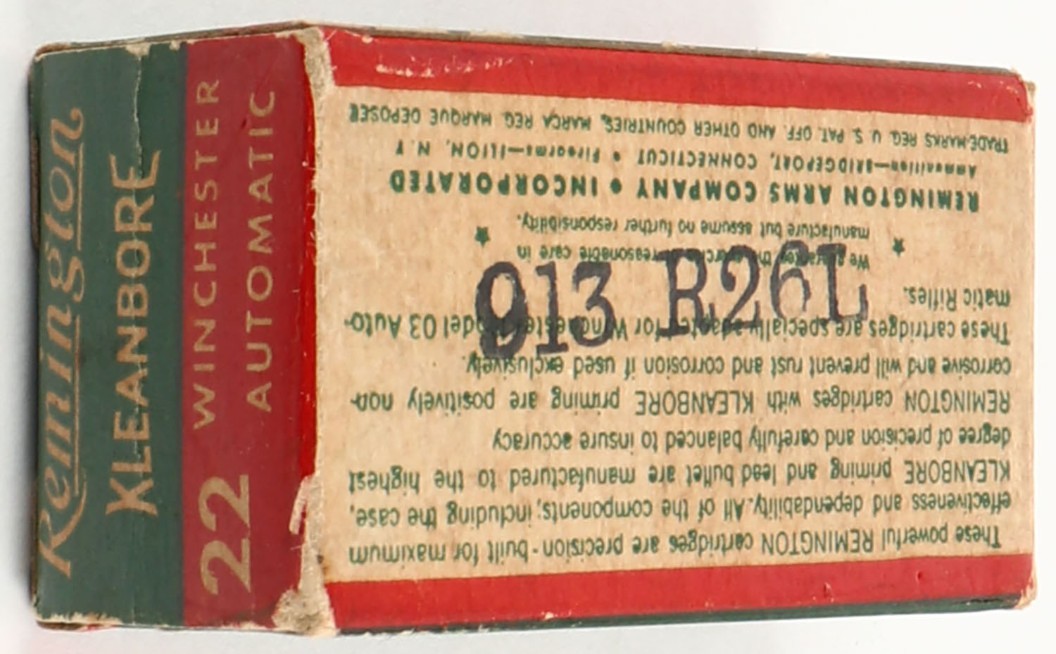 Remington, Kleanbore, .22 Winchester Automatic, RHWeb: REM-12 WA-1a, Full, 1pc. Green buff & red box, box is solid with very good to excellent color, minor age soiling & corner wear, edges are mostly crisp, end flaps are solid, ammo is excellent. Grade: Excellent - Value: 10 to 50