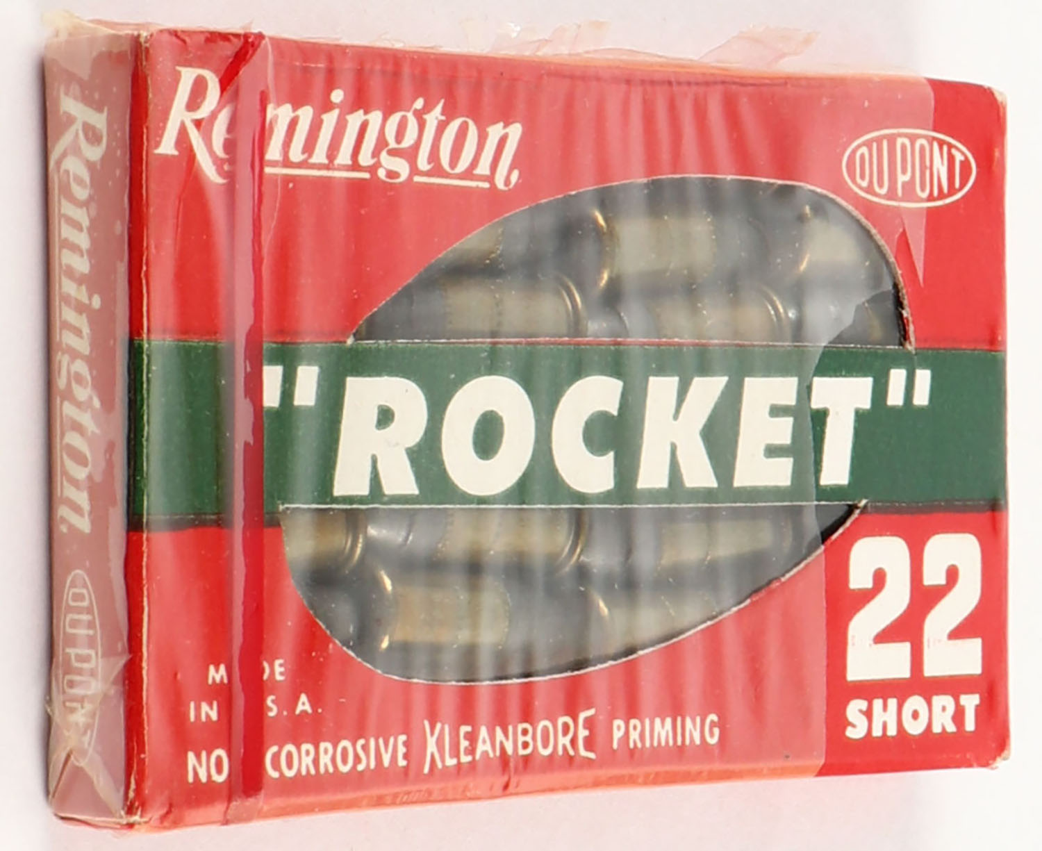 Remington, ''Rocket'', .22 Short, RHWeb: REM-14 S-5, Full & partially sealed (right end of plastic wrap is open), 1pc. Red green & white box, box is MINT with minty color, corners are sharp, edges are crisp, ammo appears minty. Grade: MINT - Value: 30 to 90