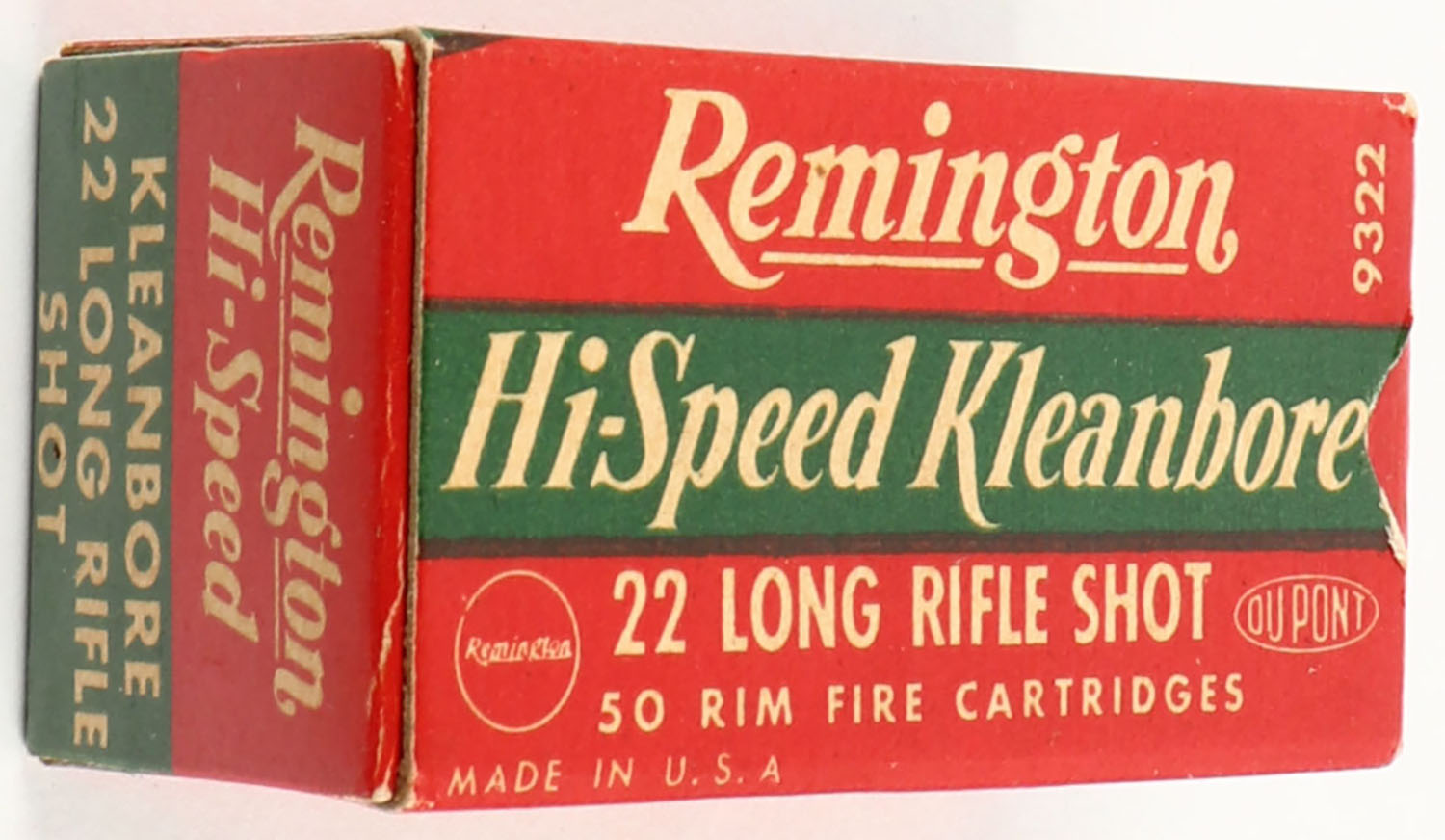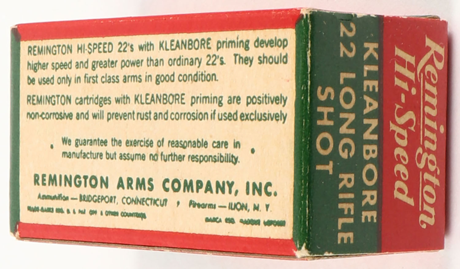 Remington, Hi-Speed Kleanbore, .22 Long Rifle Shot, RHWeb: REM-14 LR-5c, Full, 1pc. Red green & white box, box is solid with excellent color, very minor age soiling & corner wear, edges are crisp, end flaps are solid, ammo is excellent to minty. Grade: Excellent ++ - Value: 10 to 50