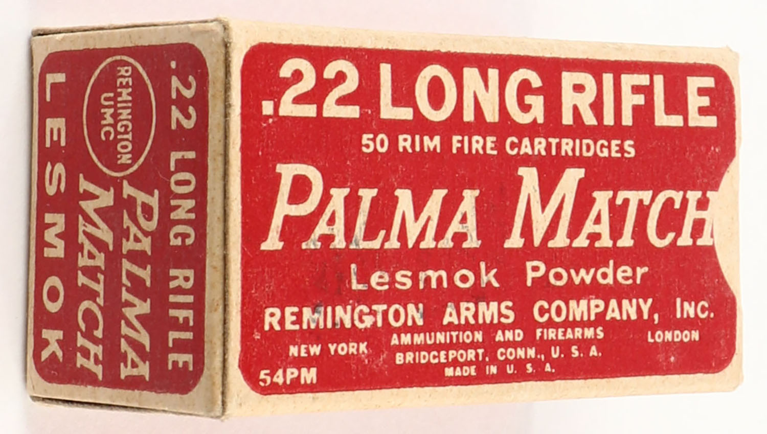 Remington, Palma Match, .22 Long Rifle, RHWeb: REM-52 LR-4, Full, 1pc. Red & buff box, box is solid with excellent color, very minor staining on top, corners are sharp, edges are crisp, end flaps are solid, ammo is very good. Grade: Excellent + - Value: 10 to 50