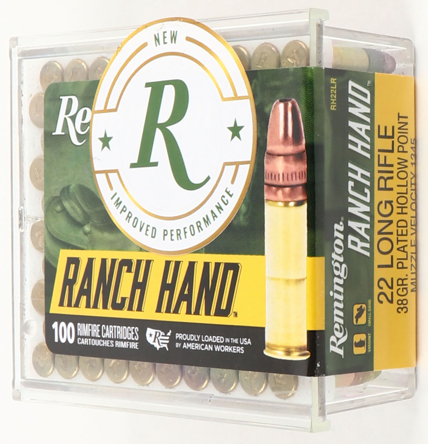 Remington, Ranch Hand, .22 Long Rifle, 38 Gr. Plated Hollow Point, 1345 FPS, FULL & SEALED, 2pc. Clear plastic tray with green & yellow sealing label, box is MINT, ammo is mint. Grade: MINT - Value: 20 to 80