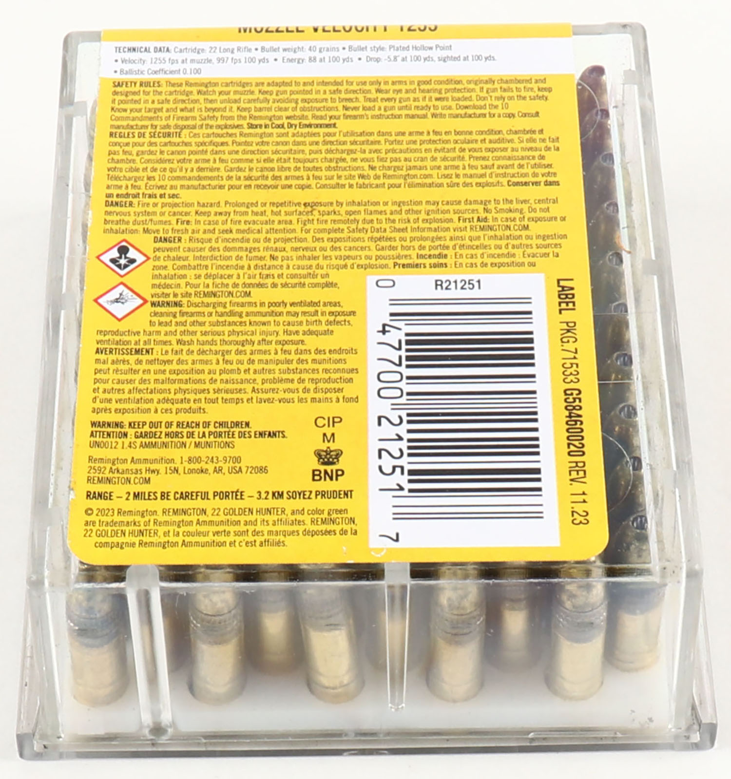 Remington, Golden Hunter, .22 Long Rifle Hollow Point, 40 Grain Plated H.P., 1255 FPS, FULL & SEALED, 2pc. Clear plastic tray with green sealing label, box is MINT with mint color, ammo appears mint. Grade: MINT - Value: 20 to 80