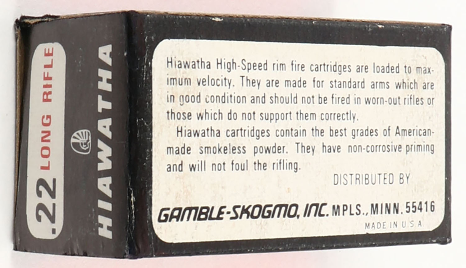 Gambles, Hiawatha, .22 Long Rifle, RHWeb: GS-5 LR-1a, Full, 1pc. White black & red box, box is solid with excellent color, very minor corner wear, edges are crisp, end flaps are solid, ammo is excellent to minty. Grade: Excellent ++ - Value: 40 to 120