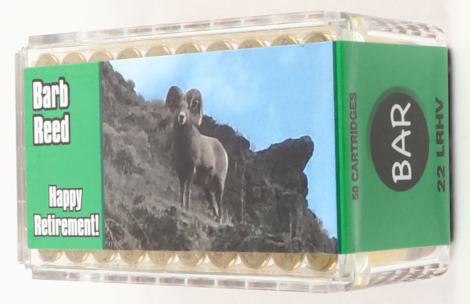 CCi, Barb Reed Retirement Commemorative box, .22 Long Rifle, Standard Velocity, FULL & SEALED, 2pc. Clear plastic tray with multi-colored sealing label featuring a bighorn ram, box is MINT with mint color, label is mint, ammo appears mint. Grade: MINT - Value: 50 to 150