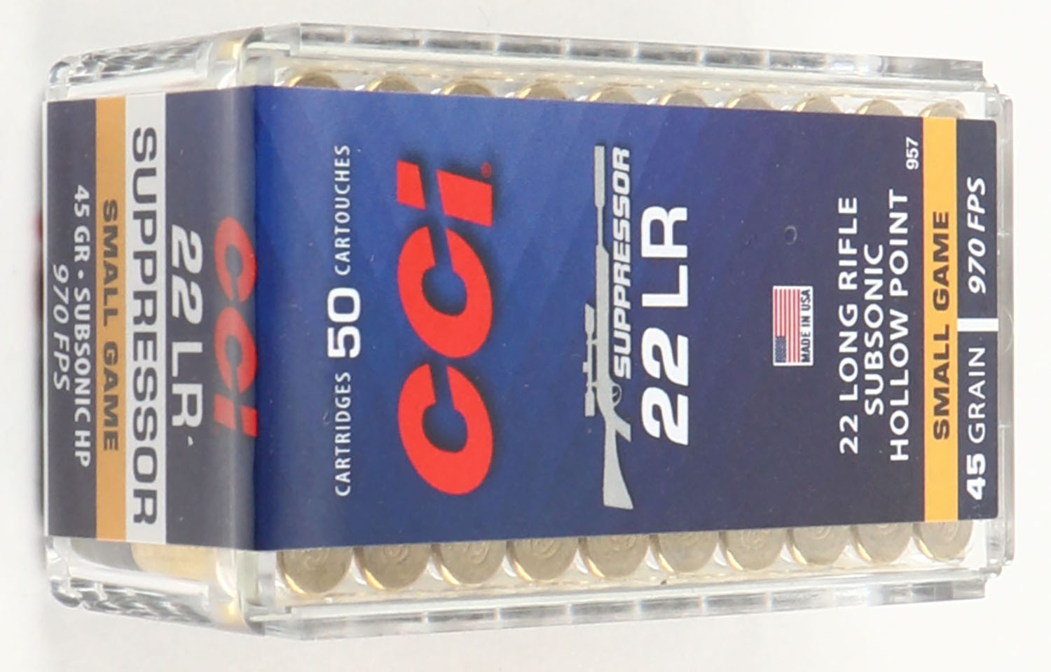 CCi, Suppressor, .22 Long Rifle Hollow Point, Subsonic, 45 Grain, 970 FPS, FULL & SEALED, 2pc. Clear plastic tray with blue sealing label, box is MINT with mint color, label is mint, ammo appears mint. Grade: MINT - Value: 8 to 40