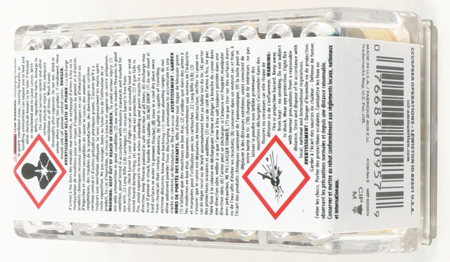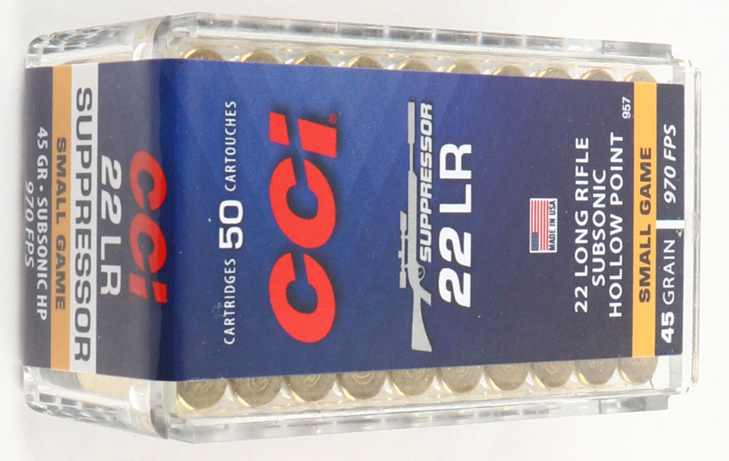 CCi, Suppressor, .22 Long Rifle Hollow Point, Subsonic, 45 Grain, 970 FPS, FULL & SEALED, 2pc. Clear plastic tray with blue sealing label, box is MINT with mint color, label is mint, ammo appears mint. Grade: MINT - Value: 8 to 40