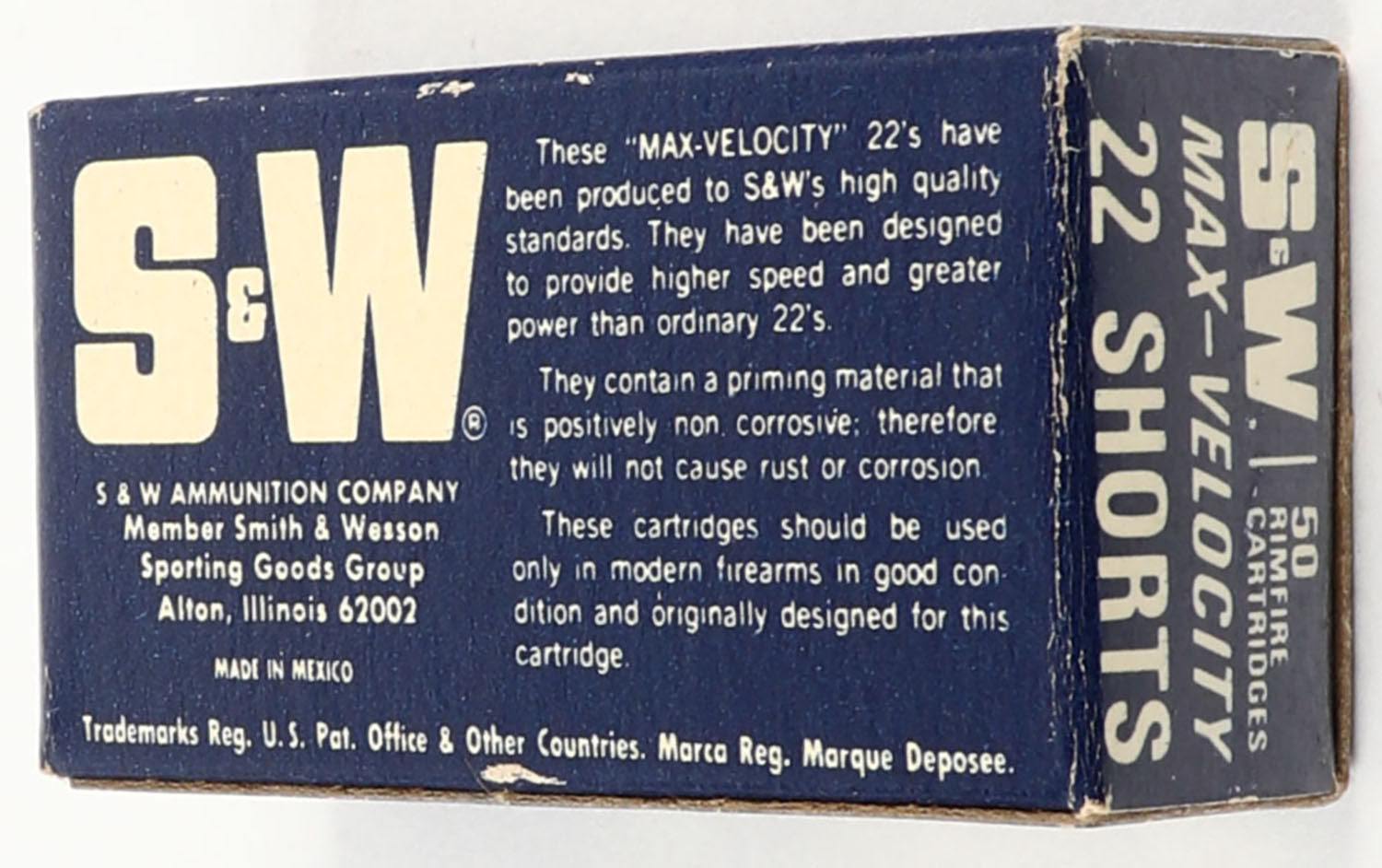 Smith & Wesson, .22 Short, Max-Velocity, RHWeb: S&W-2 S-3, Full, 1pc. Blue & white box, box is near mint with minty color, only very minor corner wear, edges are crisp, end flaps are solid, ammo is minty. Grade: Excellent ++ - Value: 10 to 50