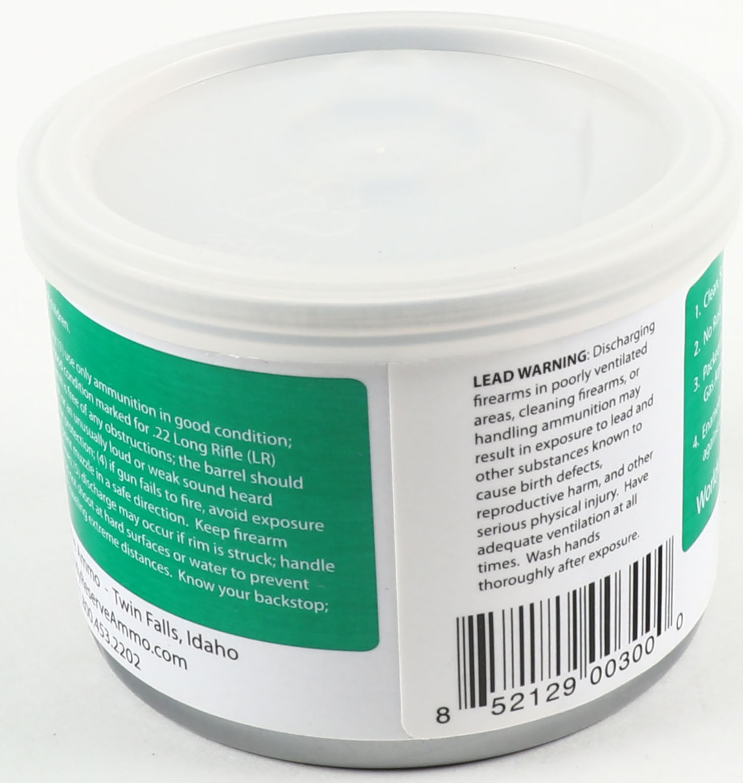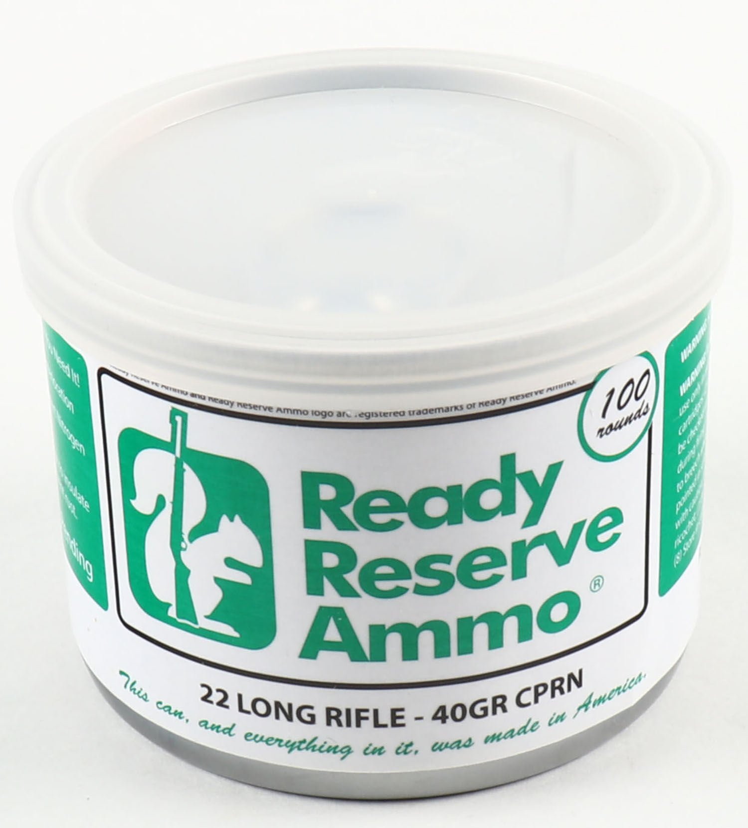 Ready Reserve Ammo, .22 Long Rifle, 40 Grain Copper Plated Round Nose, FULL & SEALED, 100rds. 1pc. Sealed tin can with plastic cap, white label with green & black printing, tin is MINT with minty color, no rust, label is intact. Grade: MINT - Value: 20 to 80