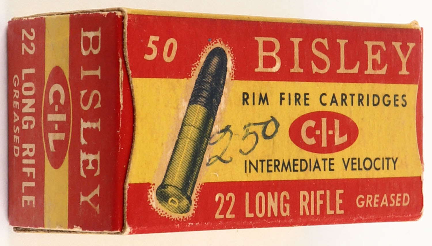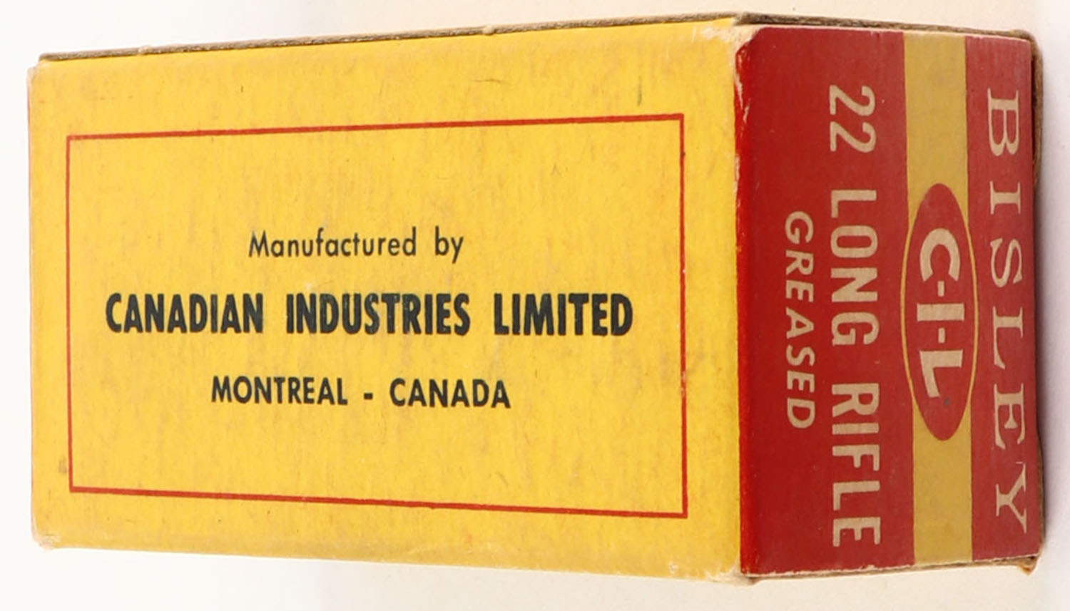 C.I.L., Bisley, .22 Long Rifle, Intermediate Velocity, Greased, RHWeb: (Canada) CIL-4 LR-7 Full, 1pc. Yellow & red box, box is solid with very good to excellent color, minor age soiling, top has been written on, very minor corner wear, edges are crisp, end flaps are solid, ammo is very good to excellent. Grade: Very Good ++ - Value: 10 to 50