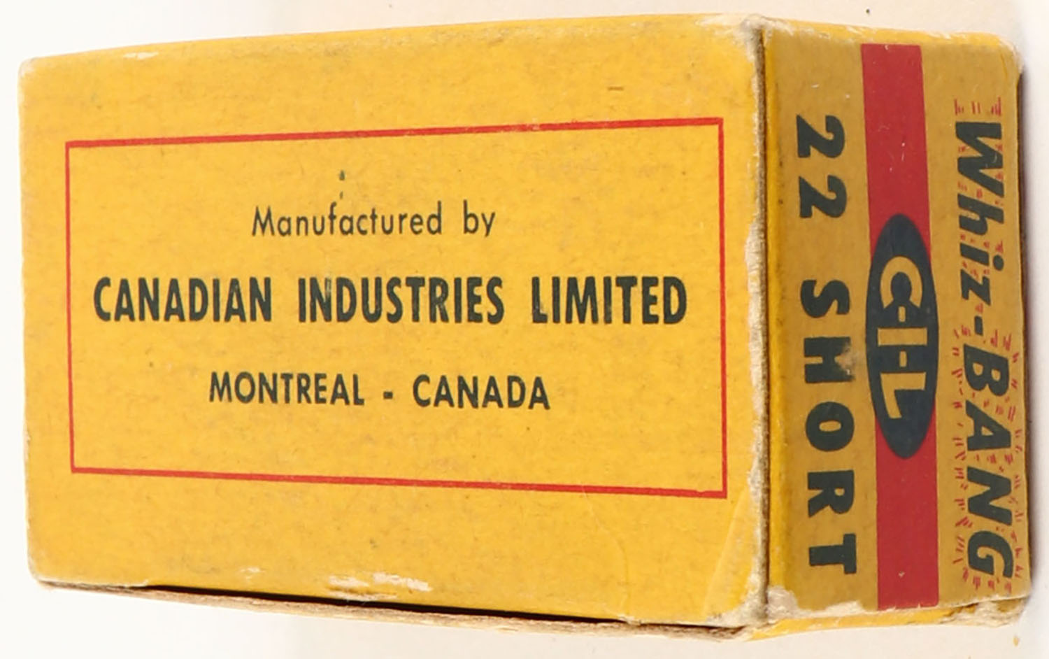 C.I.L., Whiz-Bang High Velocity, .22 Short, Dry Lubricated, RHWeb: (Canada) CIL-4 S-3, Full, 1pc. Yellow & red box, box is solid with very good color, some color fading, minor age soiling, some edge & corner wear, top flap is solid, ammo is excellent. Grade: Very Good ++ - Value: 8 to 40