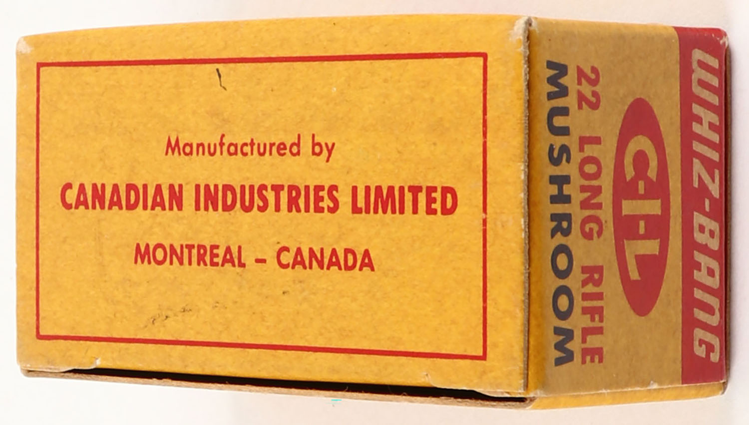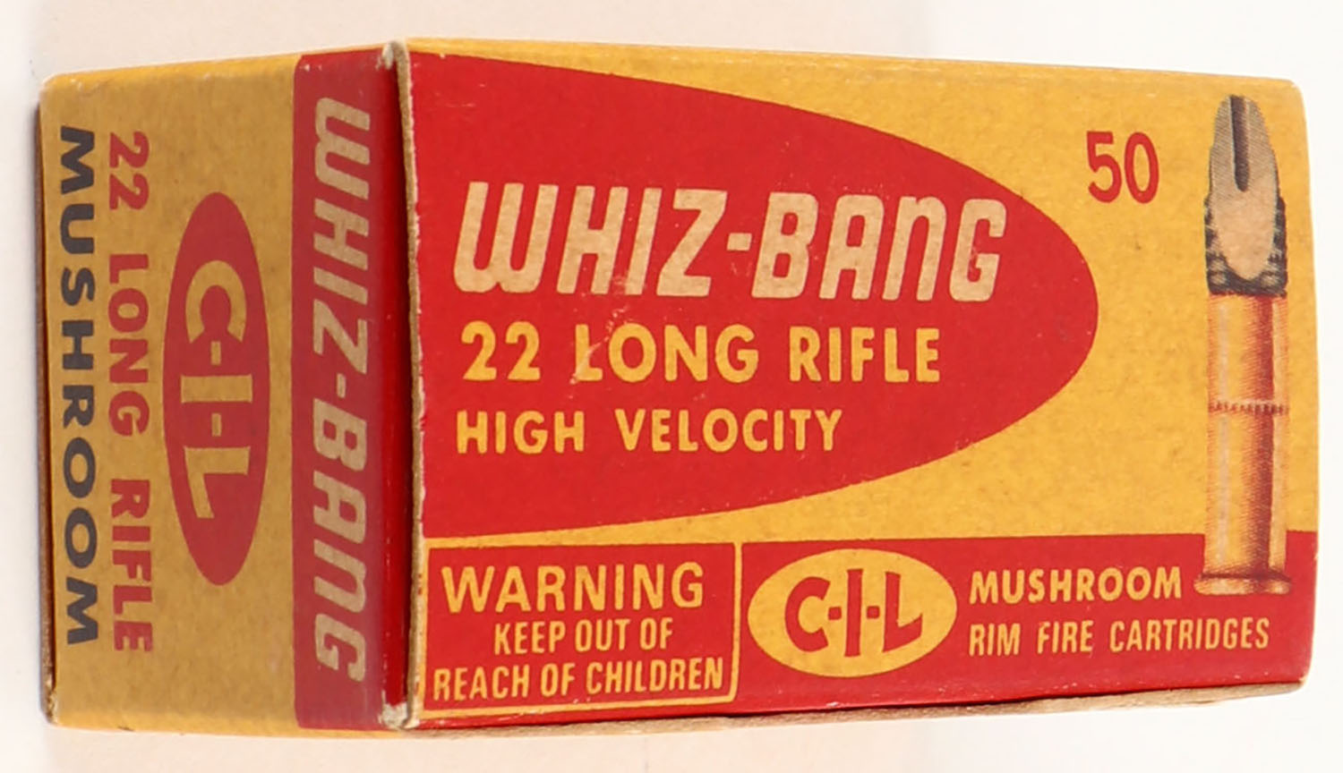 C.I.L., Whiz-Bang, .22 Long Rifle Mushroom, High Velocity, RHWeb: (Canada) CIL-6 LR-3, Full, 1pc. Yellow & red box, box is solid with excellent color, minor age soiling, corners are sharp, very minor edge wear, top flap is solid, ammo is excellent to minty. Grade: Excellent + - Value: 10 to 50