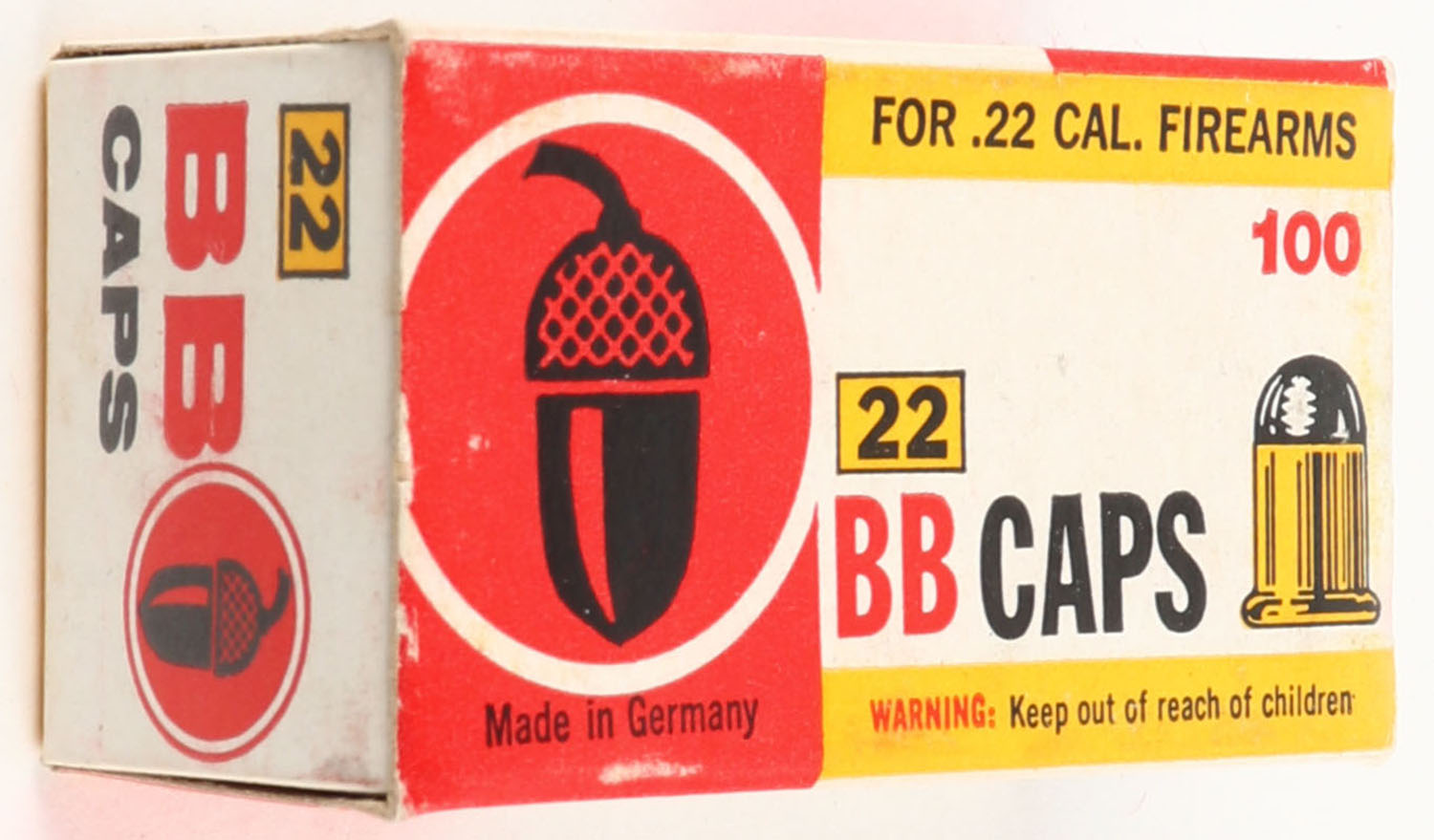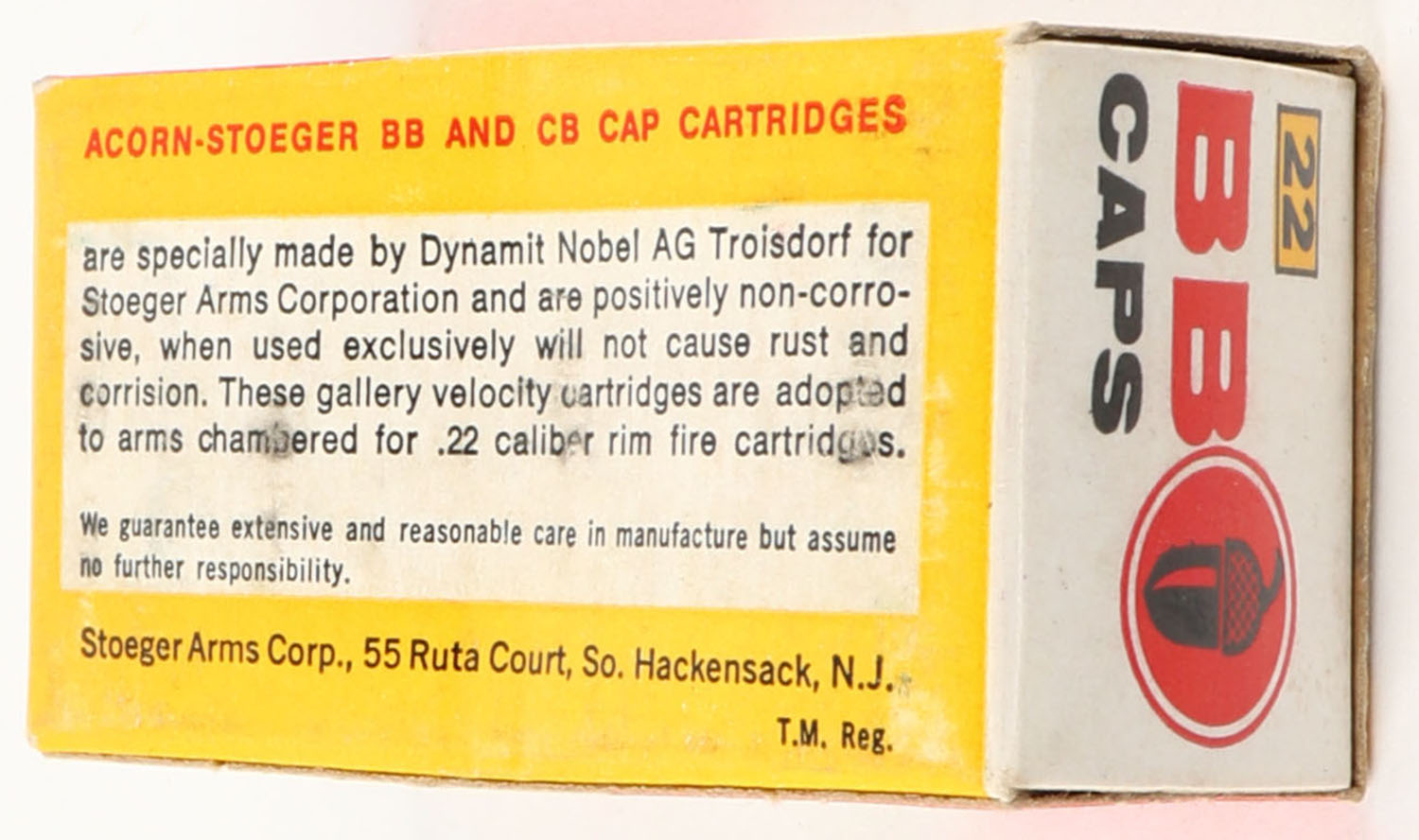 Acorn-Stoeger, .22 BB Caps, German mfg., Not in RHWeb, Appears full, 1pc. White red & yellow box, box is solid with excellent color, only very minor shelf & corner wear, edges are crisp, end flaps are solid, ammo is excellent. Grade: Excellent ++ - Value: 10 to 50
