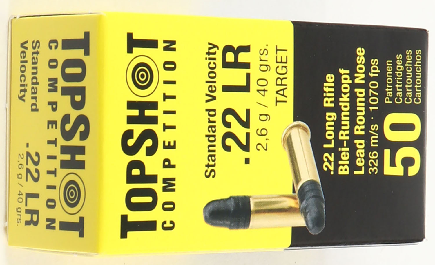 TopShot, Competition, .22 Long Rifle, Standard Velocity, 40 Grain Lead Round Nose, RHWeb: (Germany) MISC-99 LR-9b, Full, 1pc. Yellow & black box, box is MINT with minty color, corners are sharp, edges are crisp, end flaps are solid, ammo is mint. Grade: MINT - Value: 10 to 50
