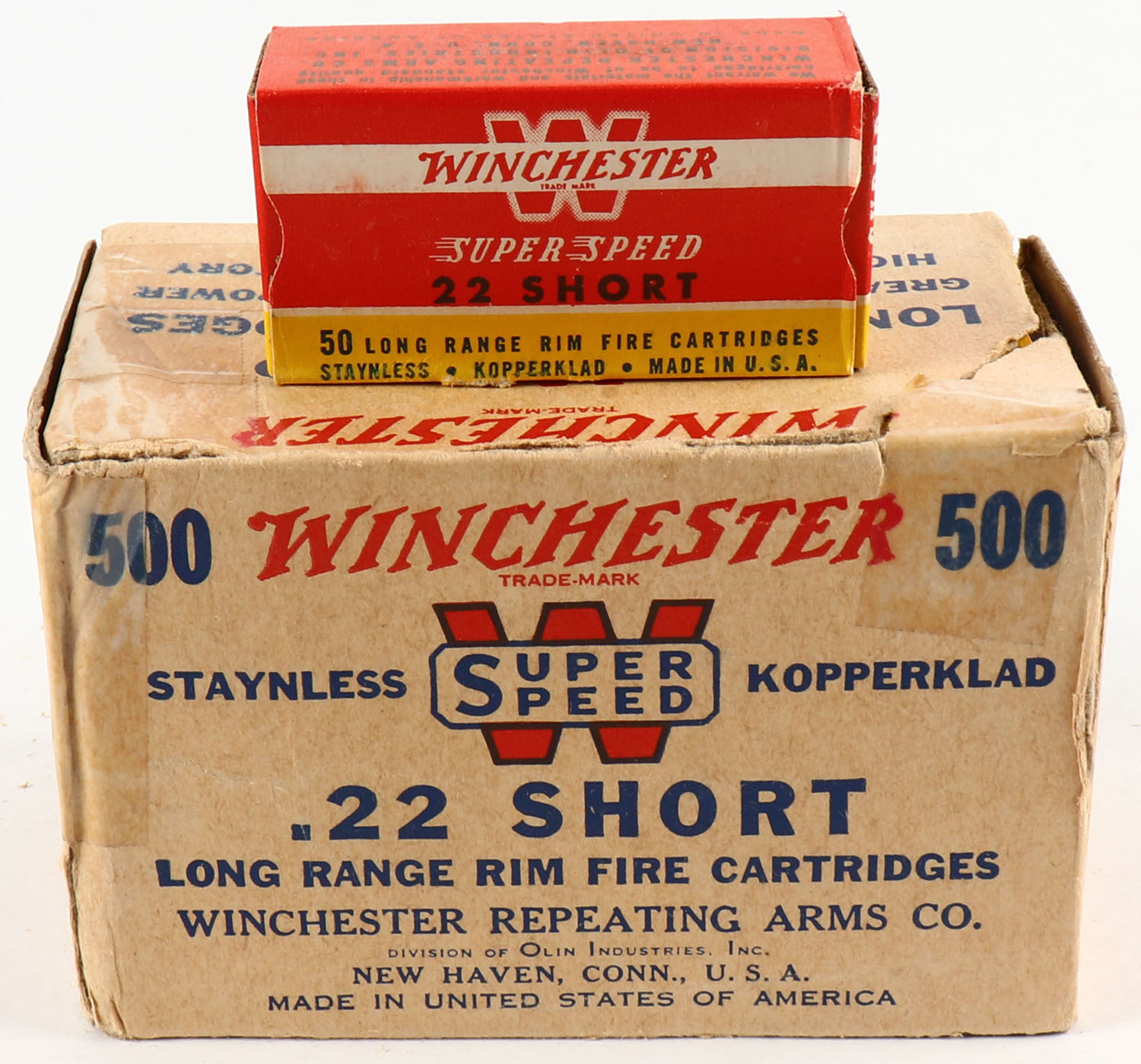 Winchester, Super Speed, .22 Short, Staynless Kopperklad, Full, 500rds. 1pc. Buff brick, box has several seam splits, end flaps are taped, excellent color, edge & corner wear, inside boxes are minty. Grade: Fair - Value: 60 to 240