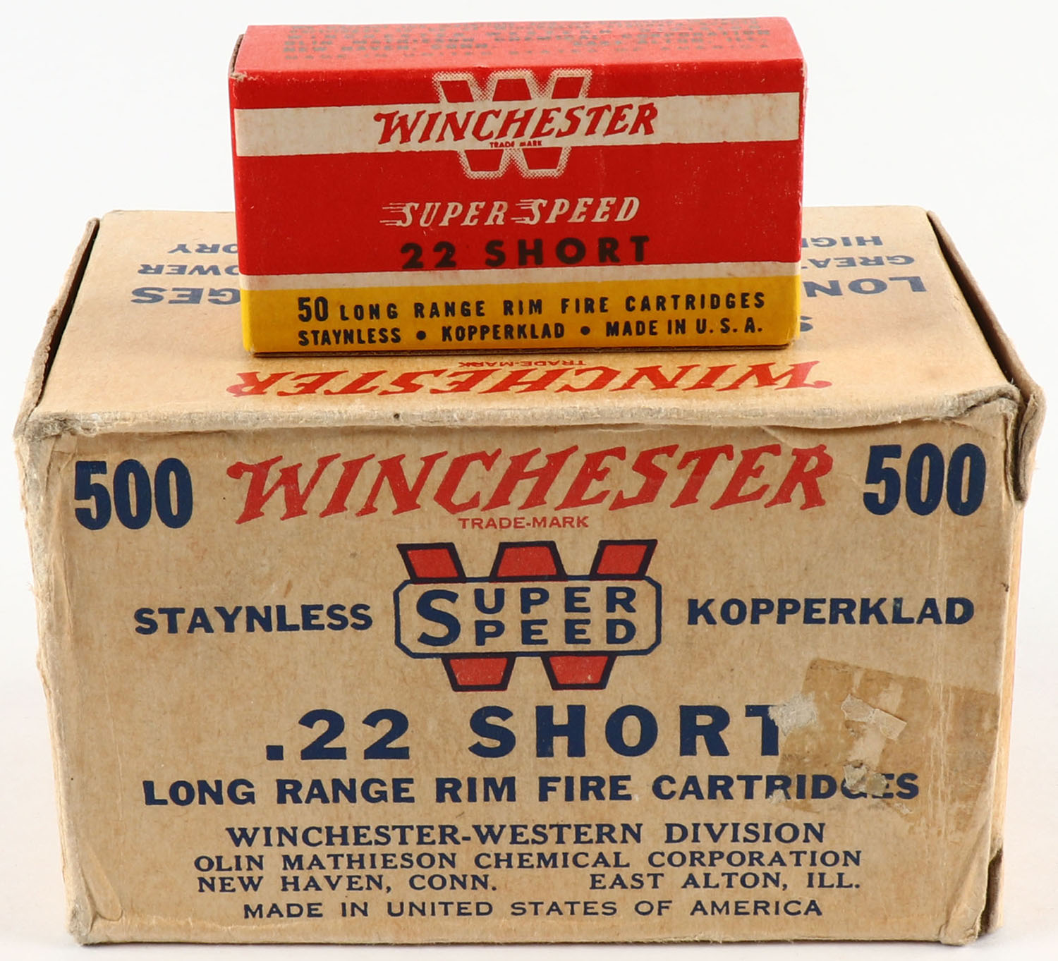 Winchester, Super Speed, .22 Short, Staynless Kopperklad, Full, 500rds., 1pc. Buff brick, brick is solid with excellent color, very minor age soiling, tape stain on top, edge & corner wear, end flaps are solid, inside boxes are minty. Grade: Very Good ++ - Value: 80 to 240