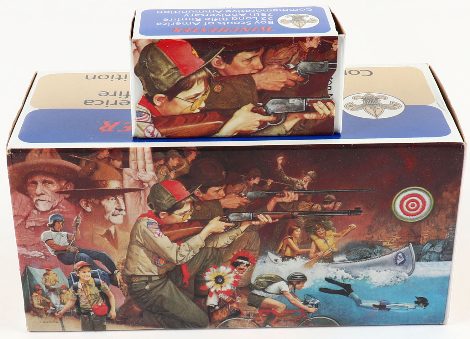 Winchester, Boy Scouts of America 75th Anniversary, .22 Long Rifle, High Velocity, 1pc., Full 500rds. brick, multi colored picture of Boy Scouts, great full color image, brick is MINT with minty color, corners are sharp, edges are crisp, end flaps are solid, inside boxes are mint. Grade: MINT - Value: 100 to 300