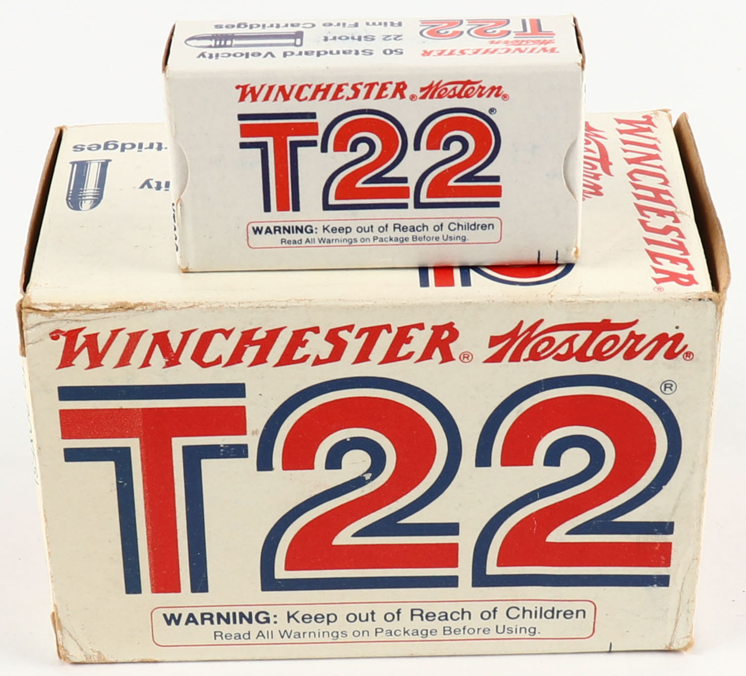 Winchester-Western, T22, .22 Short, Target Accuracy, Full, 500rds., 1pc. White red & blue brick, brick is solid with excellent color, very minor shelf wear, some corner wear, edges are mostly crisp, end flaps are solid, inside boxes are excellent. Grade: Excellent + - Value: 40 to 120