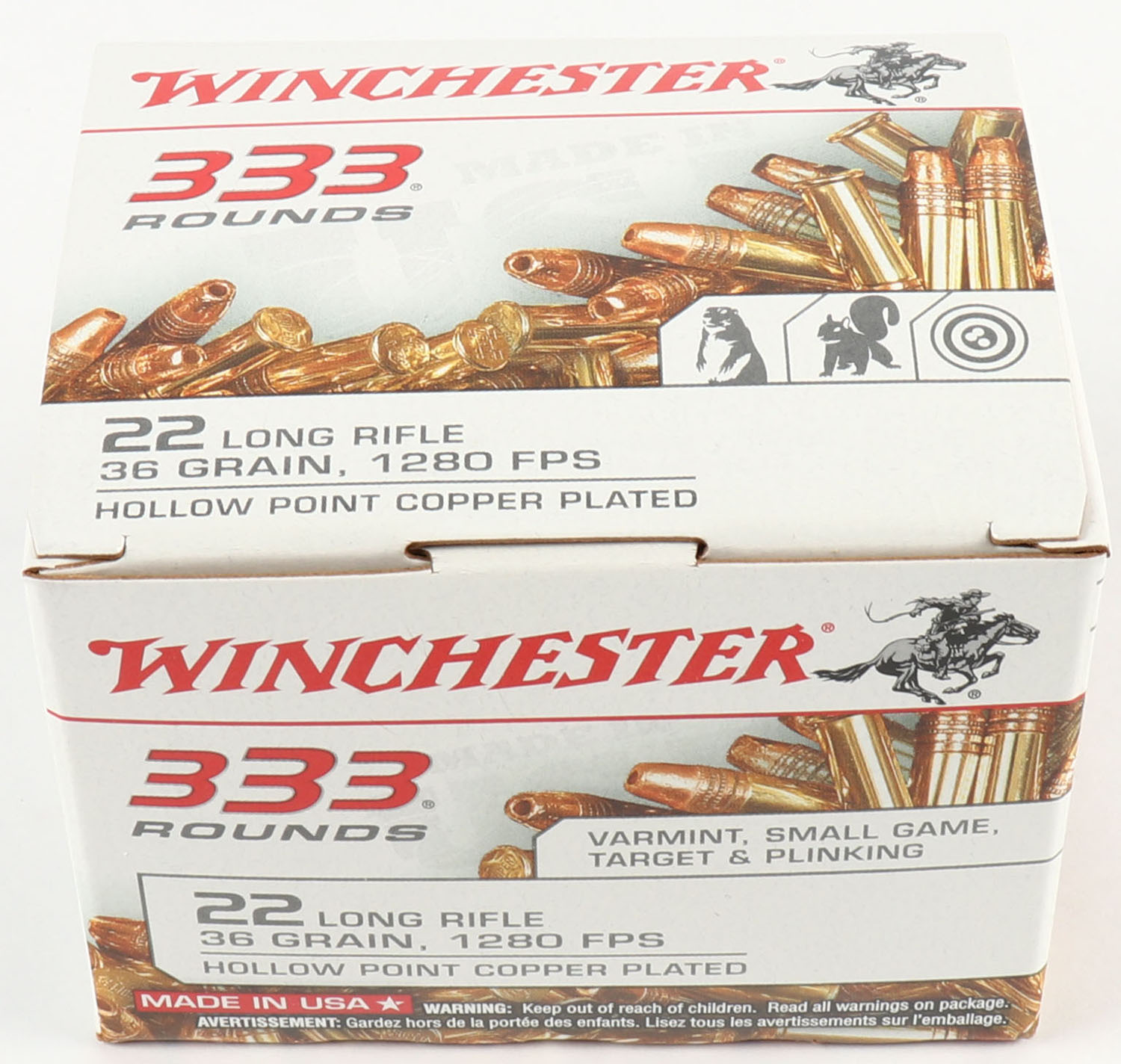 Winchester, .22 Long Rifle, 36 Grain Copper Plated Hollow Point, 1280 FPS, Full, 333rds. 1pc. White bulk box, box is MINT with minty color, corners are sharp, edges are crisp, top flap is solid, ammo is minty. Grade: MINT - Value: 14 to 40