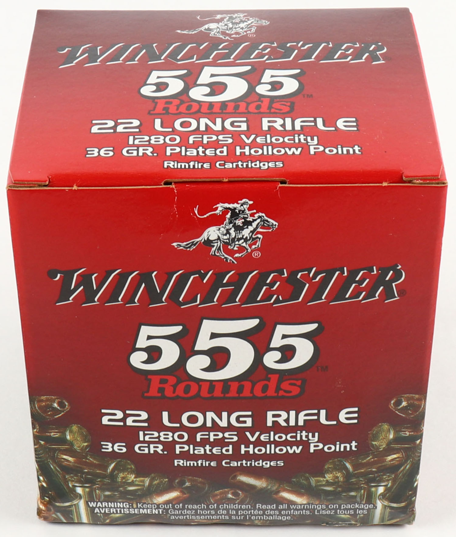Winchester, .22 Long Rifle, 36 Grain Plated Hollow Point, 1280 FPS, Full, 555rds., 1pc. Red bulk box, box is MINT with minty color, corners are sharp, edges are crisp, top flap is solid, ammo is minty. Grade: MINT - Value: 16 to 60