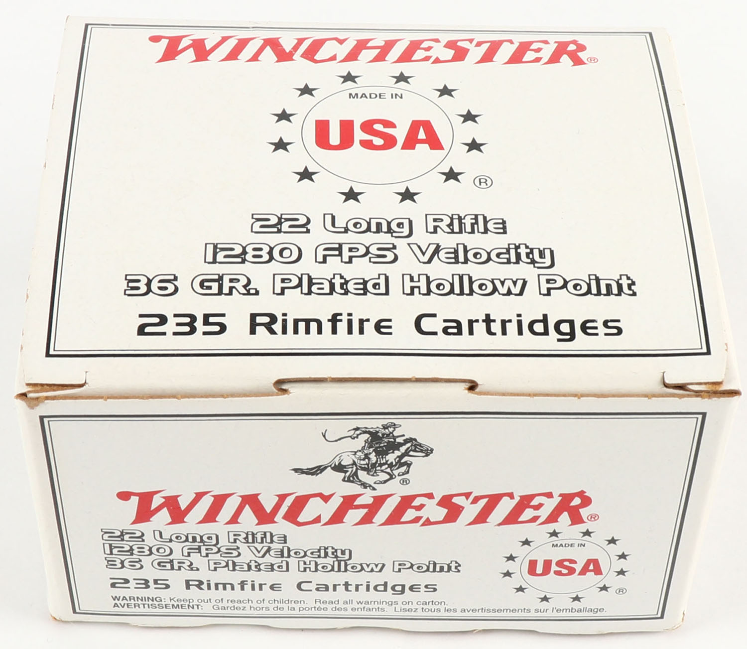 Winchester, 22 Long Rifle, 36 Grain Plated Hollow Point, Full, 235rds. White bulk box, box is MINT with minty color, corners are sharp, edges are crisp, top flap is solid, ammo is minty. Grade: MINT - Value: 10 to 40