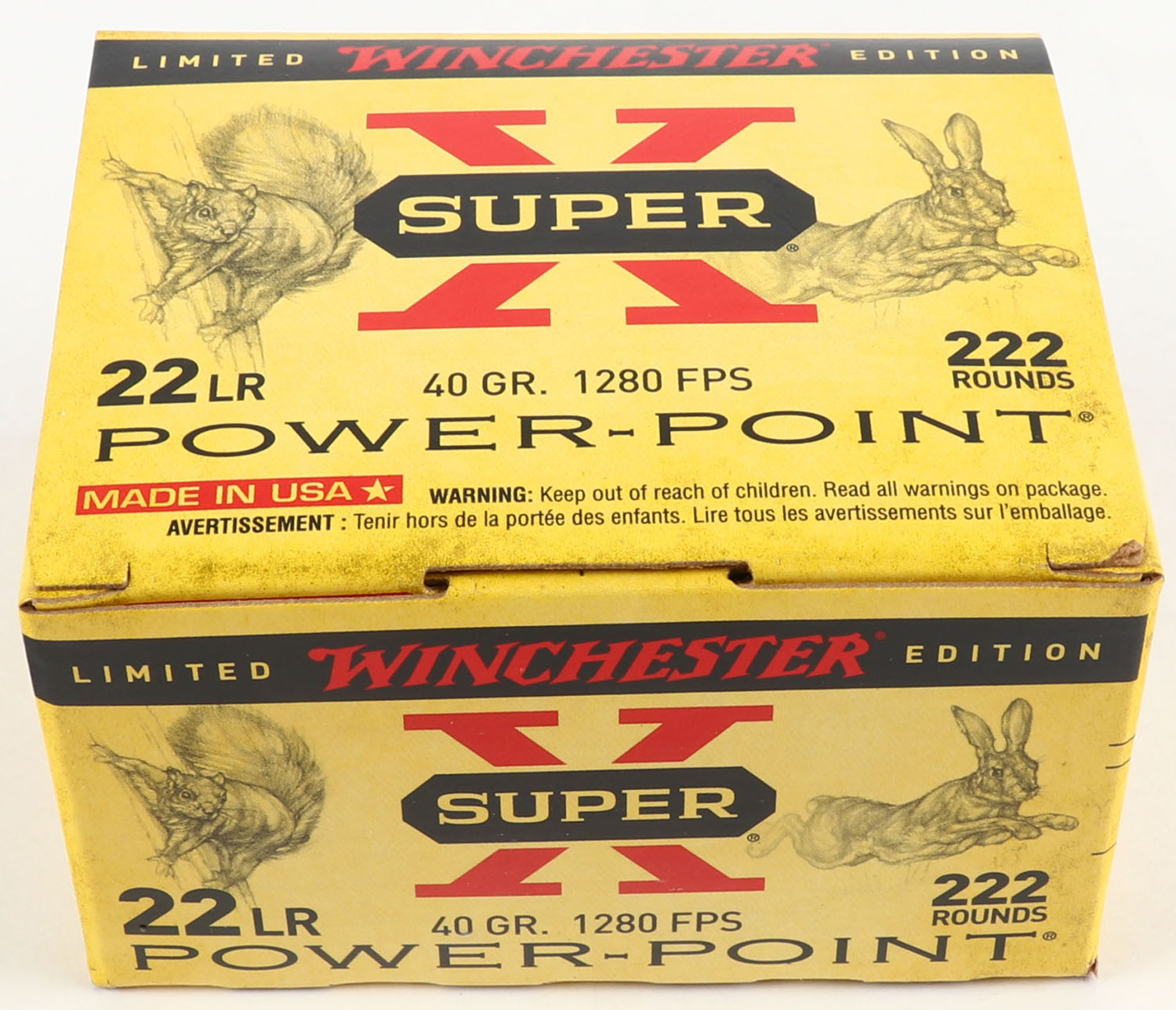 Winchester, Super-X Power-Point, .22 Long Rifle, 40 Grain Bullet, 1280 FPS, Full, 222rds., 1pc. Yellow black & red bulk box, box is MINT with minty color, corners are sharp, edges are crisp, top flap is solid, ammo is minty. Grade: MINT - Value: 24 to 72