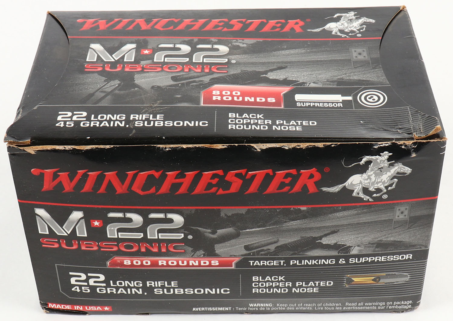 Winchester, M22 Subsonic, .22 Long Rifle, 45 Grain Black Copper Plated Round Nose, Full, 800rds., 1pc. Black & red brick with (2) 400rd. Bulk boxes inside, brick is solid with minty color, minor edge & corner wear, top flap is solid, inside boxes are minty. Grade: Excellent ++ - Value: 60 to 120