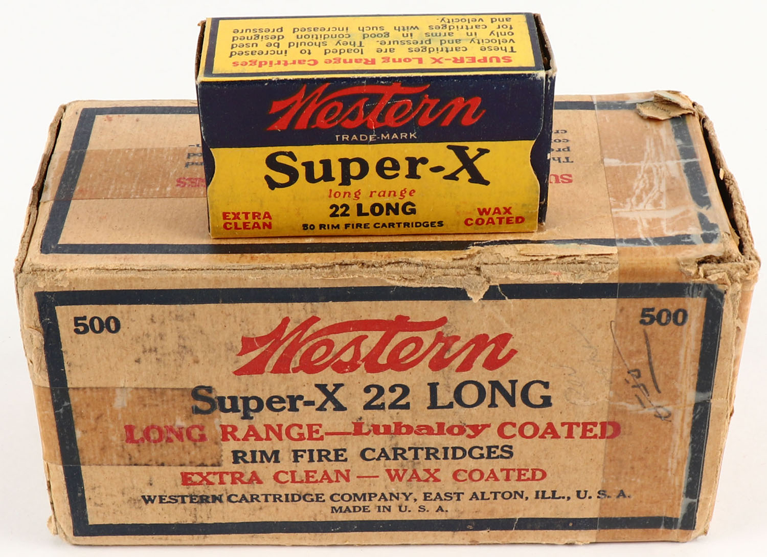 Western, Super-X, .22 Long, Extra Clean Wax Coated, Full, 500rds. 1pc. Buff brick, brick has tape on all sides, very good color, some age soiling & shelf wear, edge & corner wear, end flaps are torn & taped, inside boxes are excellent to minty. Grade: Good ++ - Value: 60 to 180