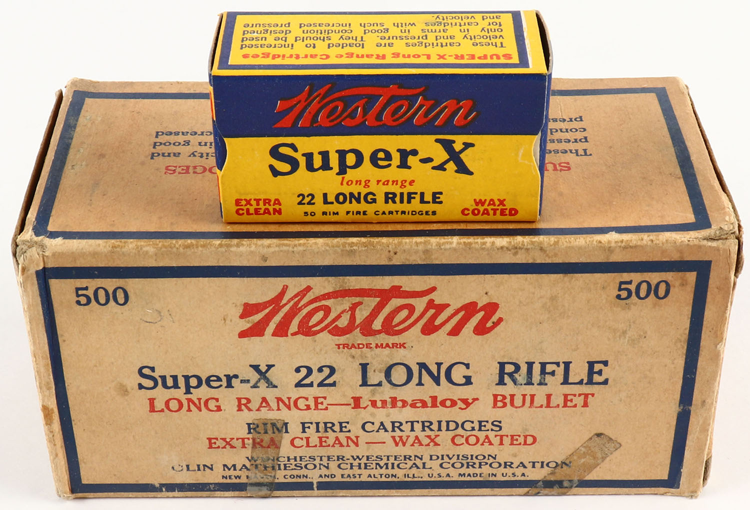 Western, Super-X, .22 Long Rifle, Extra Clean Wax Coated, Full, 500rds., 1pc. Buff brick, brick is solid with very good color, age soiling, some shelf wear, corner wear, some edge wear, end flaps are solid, inside boxes are minty. Grade: Very Good - Value: 40 to 120
