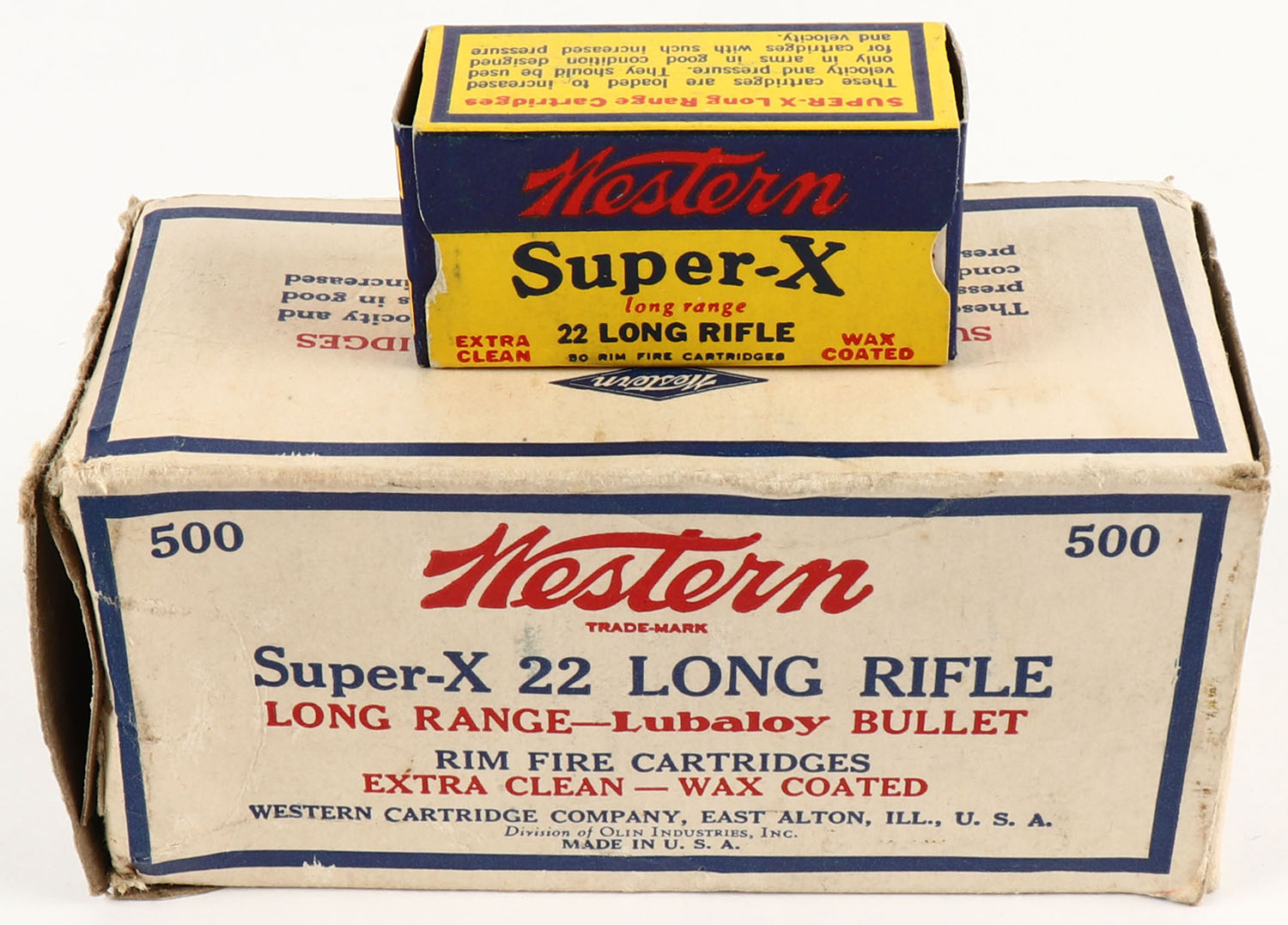 Western, Super-X, .22 Long Rifle, Extra Clean Wax Coated, Partial 6 boxes, 1pc. Buff brick, left end flap is torn off, factory seam has unadhered, very good color, some age soiling & shelf wear, corner wear, edges are mostly crisp, right end flap is solid, inside boxes are minty. Grade: Good - Value: 10 to 50
