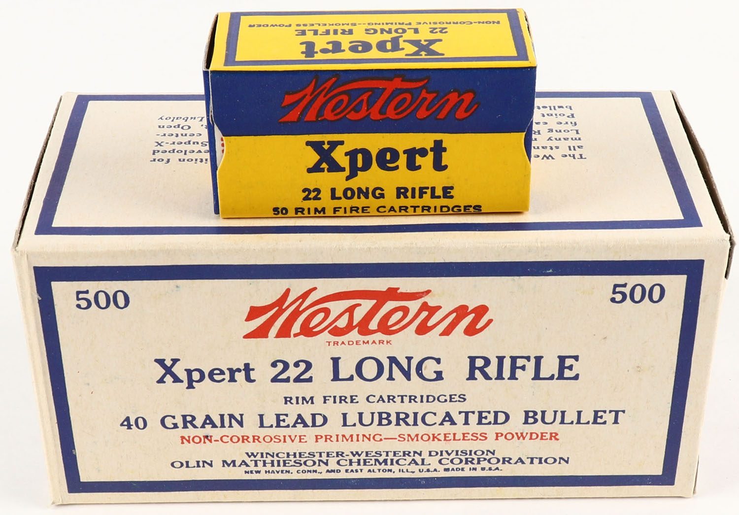 Western, Xpert, .22 Long Rifle, Lubricated, Full, 500rds., 1pc. Buff brick, brick is near mint with excellent to minty color, only very minor shelf wear, corners are sharp, edges are crisp, end flaps are solid, inside boxes are mint. Grade: Excellent ++ - Value: 80 to 240