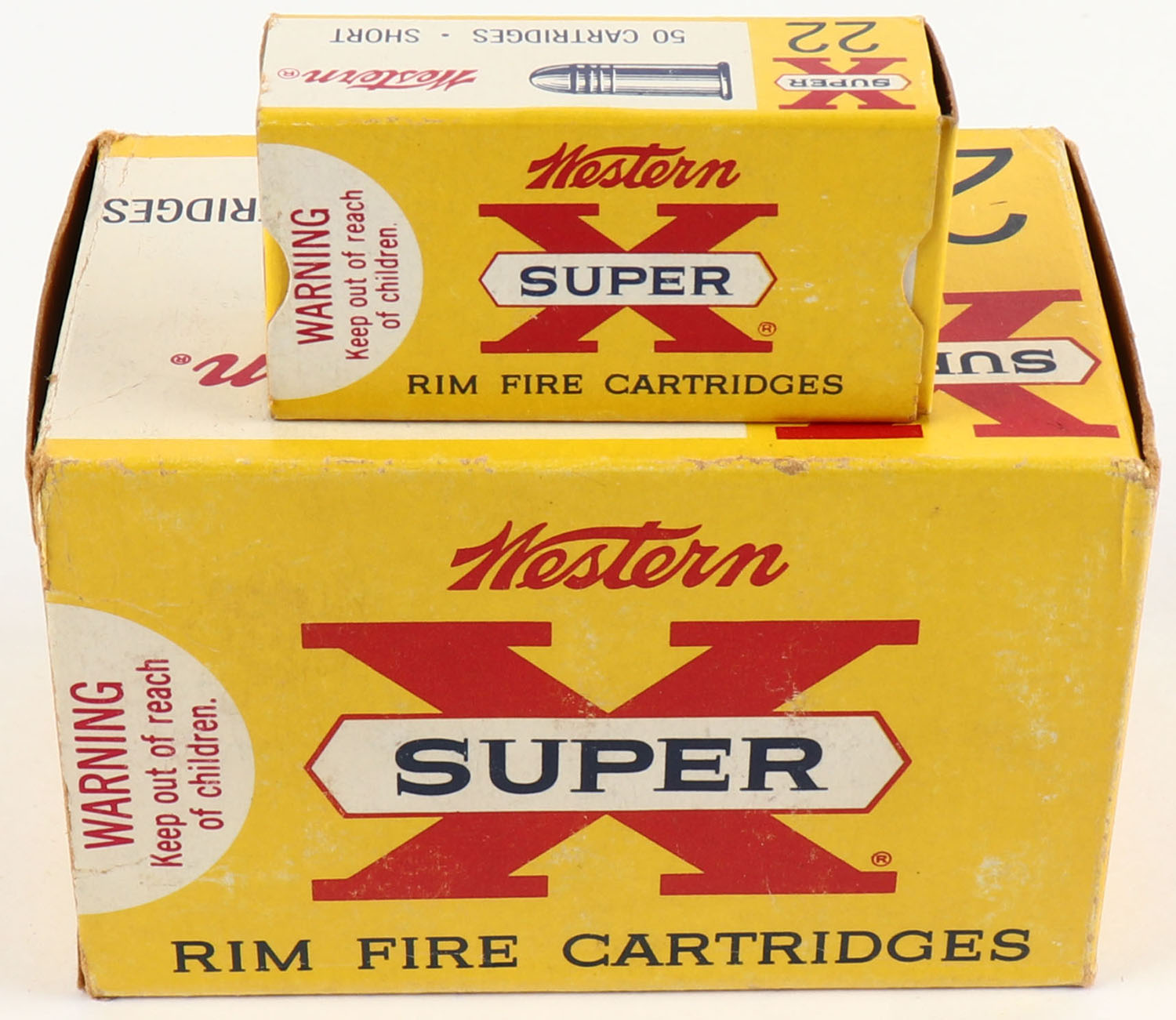 Western, Super-X, .22 Short, 29 Grain Lubaloy Coated Bullet, 500rds., 1pc. Yellow white & red brick, brick is solid with excellent color, very minor age soiling, very minor edge & corner wear, end flaps are solid, inside boxes are minty. Grade: Excellent + - Value: 20 to 80