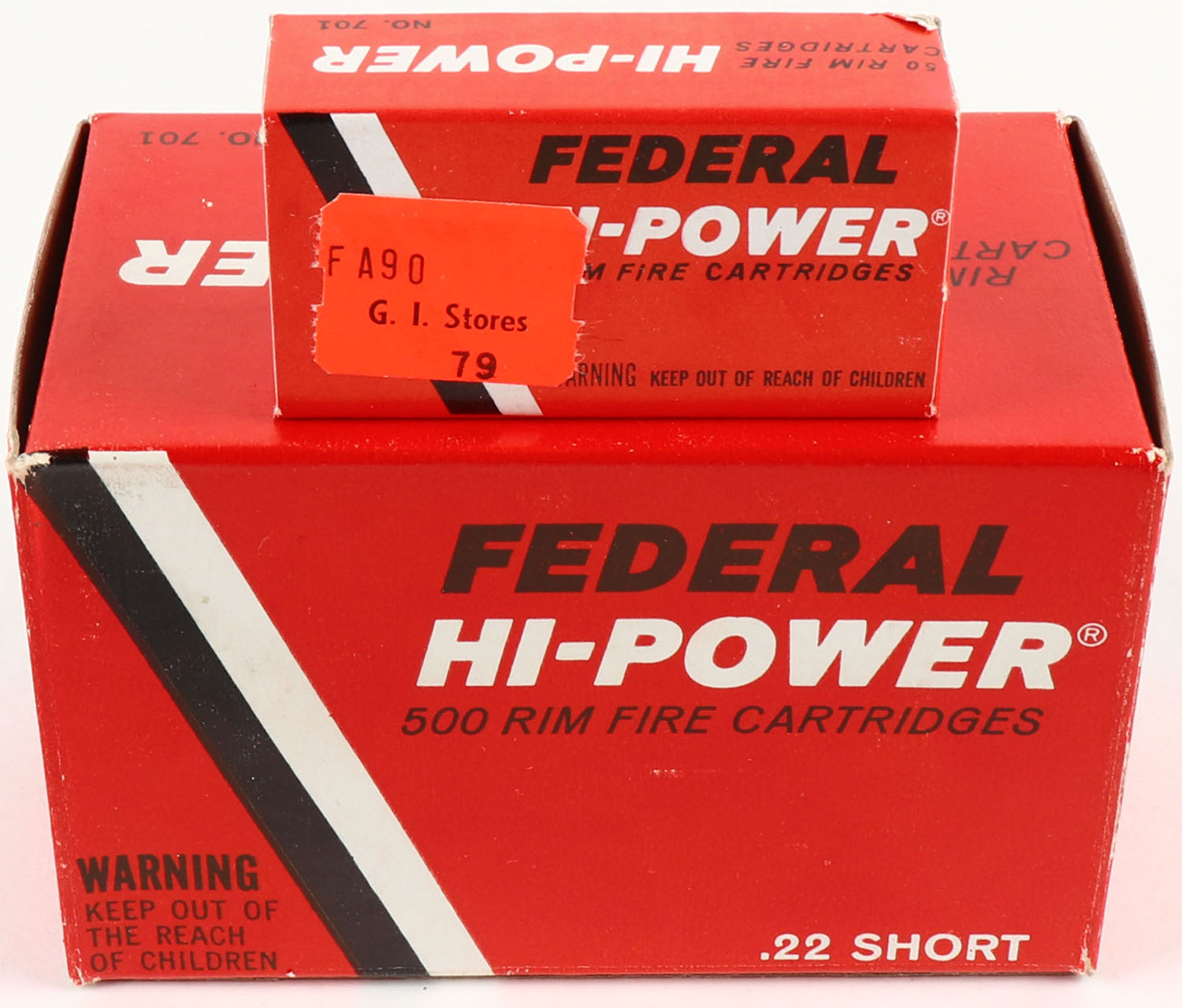 Federal, Hi-Power, .22 Short, Full, 500rds., 1pc. Red black & white brick, brick is near mint with minty color, only very minor corner wear, edges are crisp, end flaps are solid, inside boxes are minty. Grade: Excellent ++ - Value: 40 to 120
