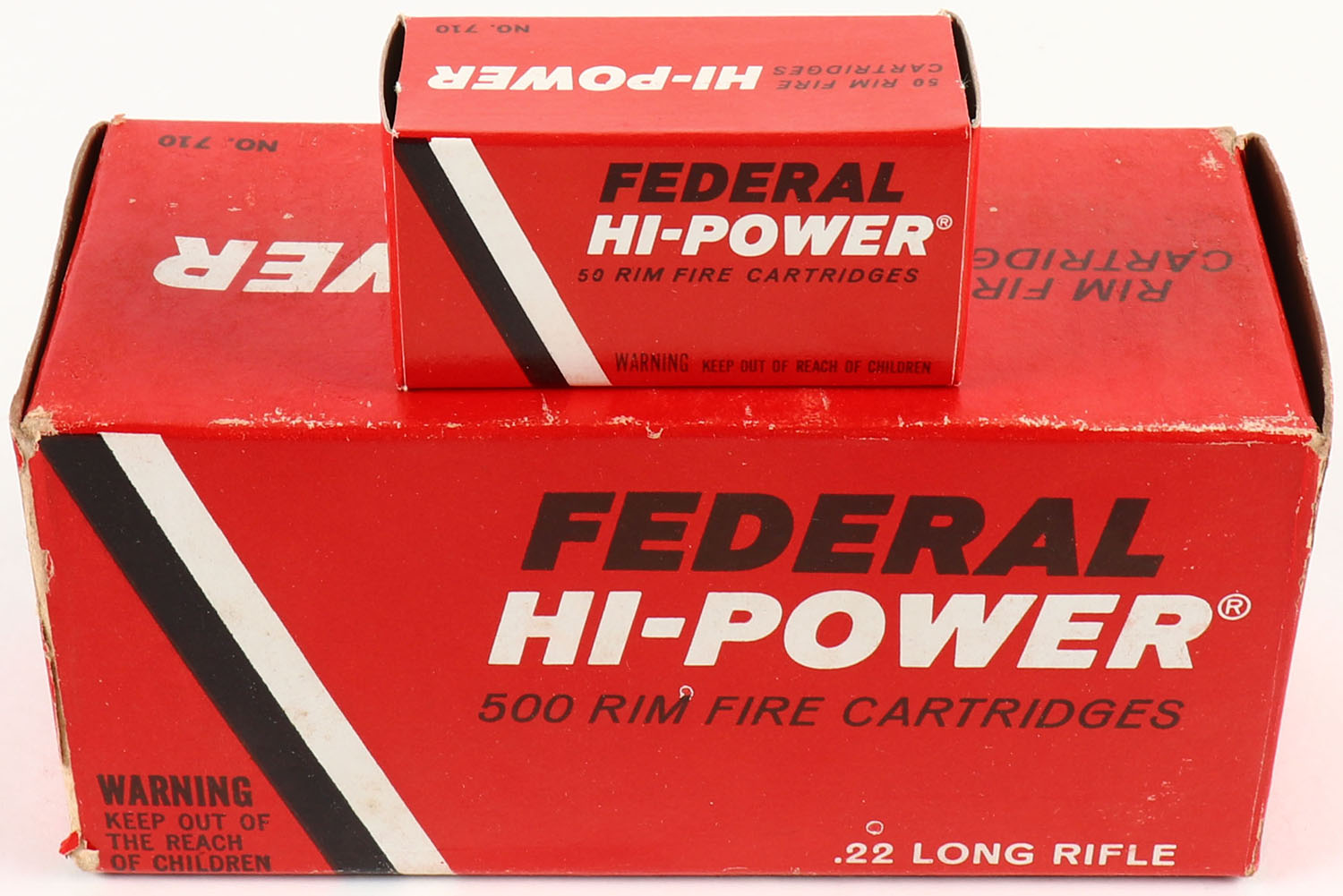 Federal, Hi-Power, .22 Long Rifle, Full, 500rds., 1pc. Red black & white brick, brick is solid with excellent color, minor shelf wear, some edge & corner wear, end flaps are solid, inside boxes are minty. Grade: Excellent + - Value: 30 to 90