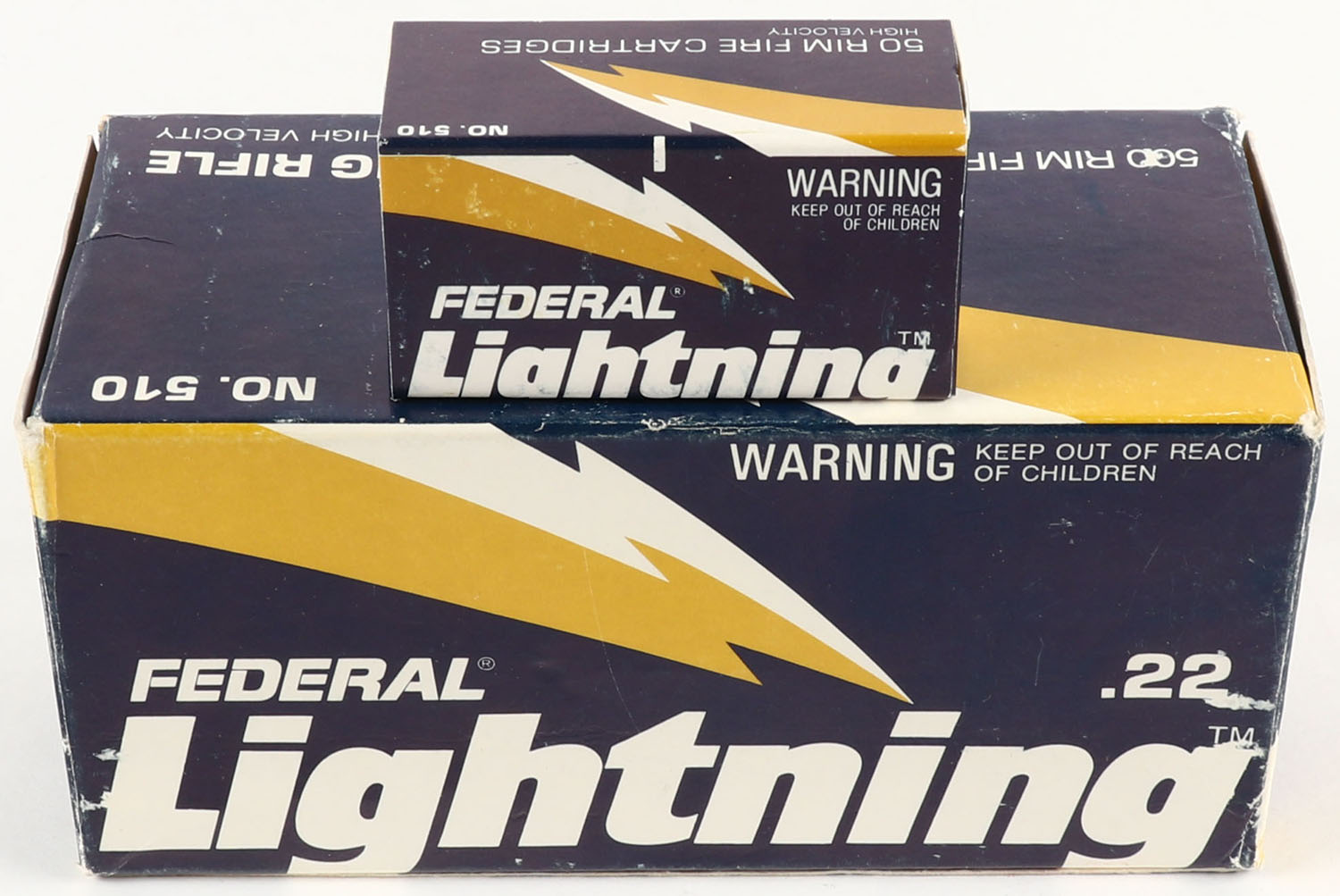 Federal, Lightning, .22 Long Rifle, Partial 7 boxes (1 box partial, 6 boxes full) 1pc. Blue white & gold brick, brick is solid with minty color, minor corner wear, edges are crisp, end flaps are solid, inside boxes are minty. Grade: Excellent + - Value: 10 to 40