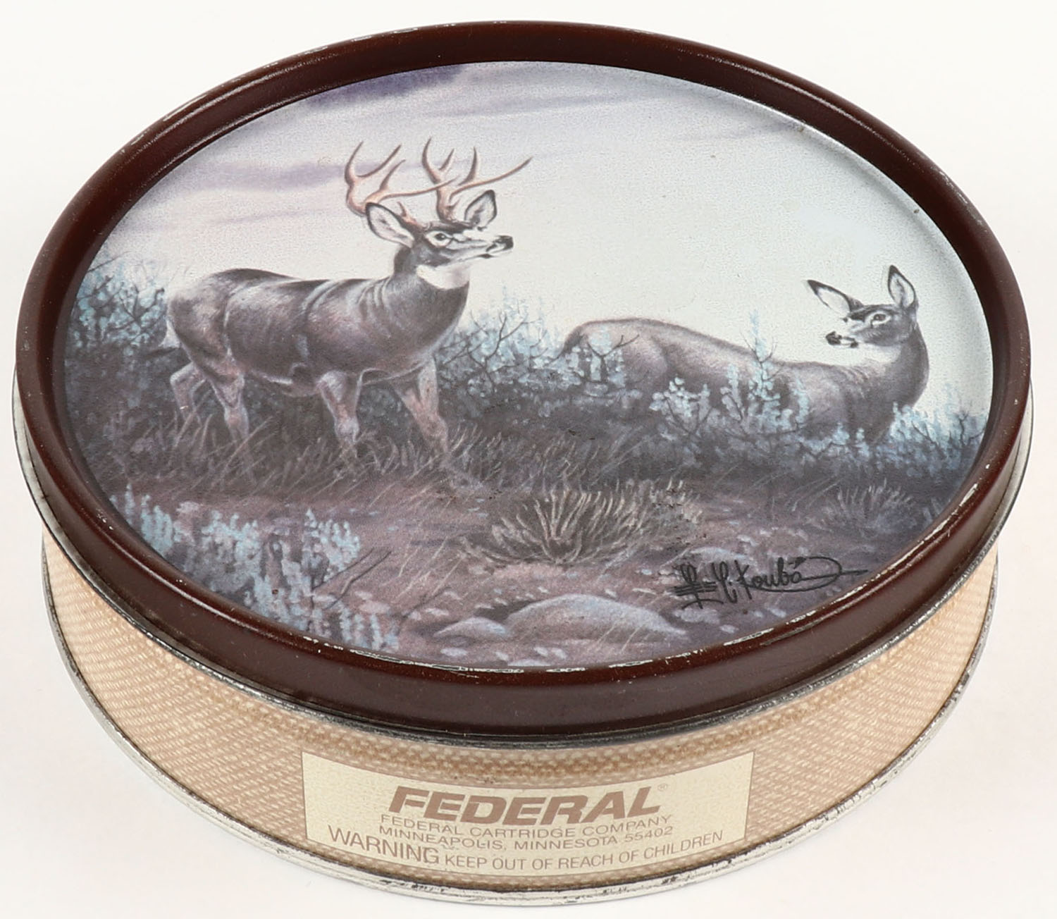 Federal, Lightning, .22 Long Rifle, Deer Collectors Tin, RHWeb: FED-16 LR-2, Full, 440rds., 2pc. Tin featuring a buck & doe, tin is near mint with minty color, very minor wear along the top rim, ammo is minty. Grade: Excellent ++ - Value: 50 to 150