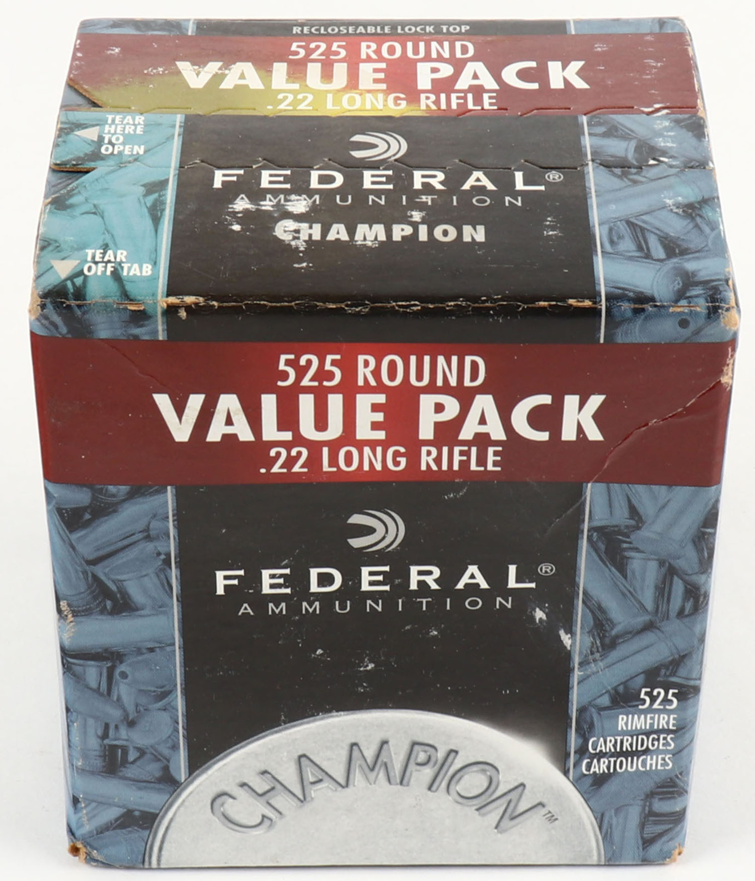Federal, Champion Value Pack, .22 Long Rifle, 36 Grain Copper Plated Hollow Point, FULL & SEALED, 525rds. 1pc. Blue black & red bulk box, box is solid with excellent color, some shelf wear, minor edge & corner wear. Grade: Excellent - Value: 10 to 50