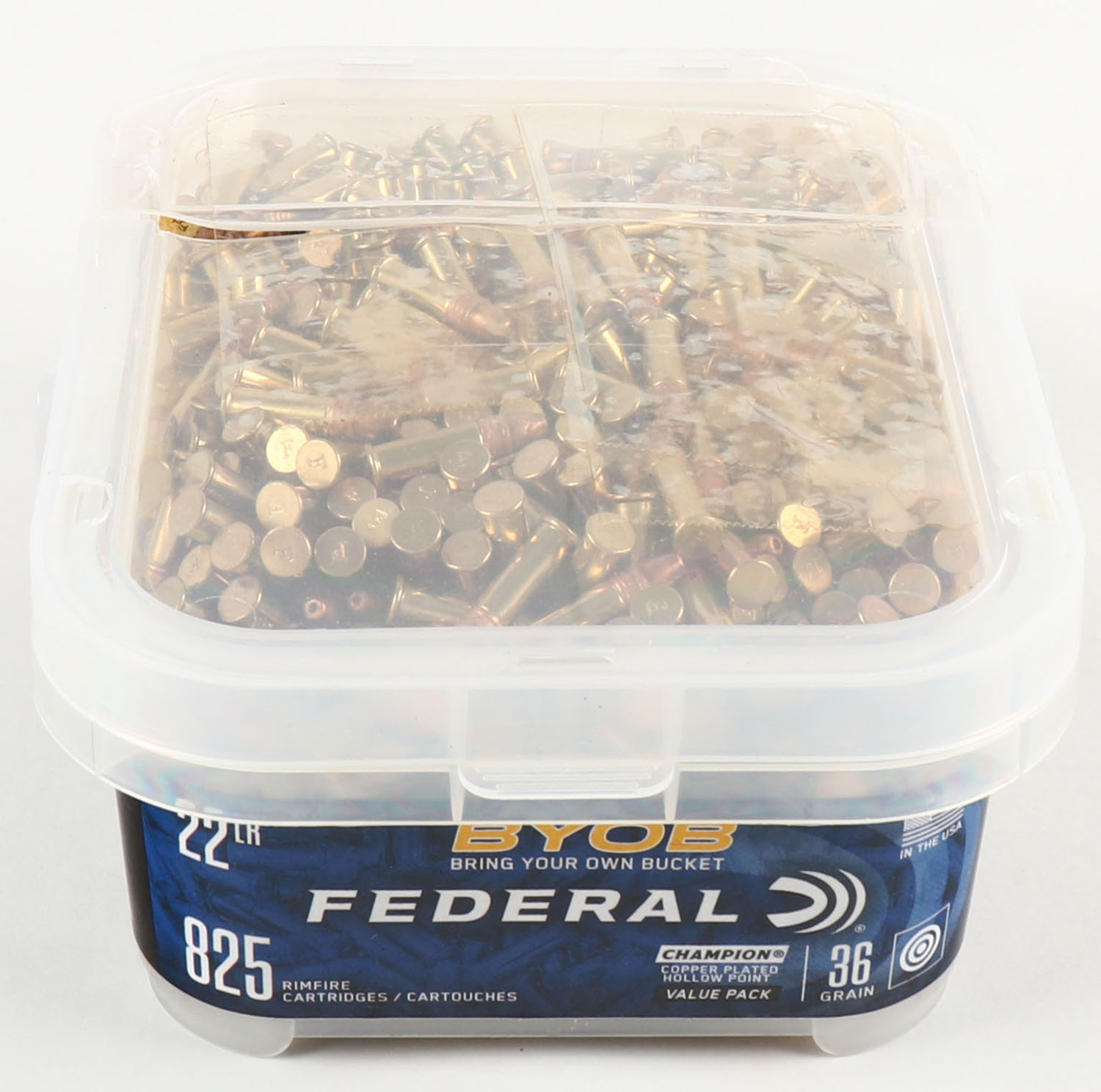 Federal, Champion, .22 Long Rifle, 36 Grain Copper Plated Hollow Point, BYOB, Full, 825rds. 1pc. Plastic bucket with blue label, bucket lid is cracked across the top and taped, label is intact, ammo is minty. Grade: Very Good - Value: 20 to 80