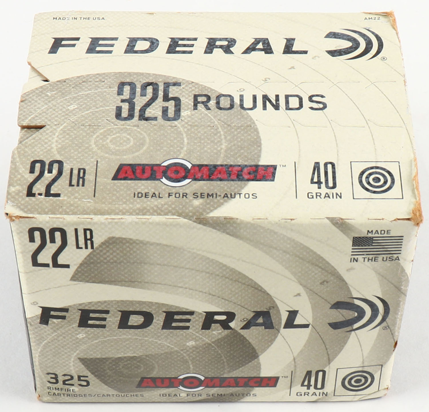 Federal, AutoMatch, .22 Long Rifle, Ideal for Semi-Autos, 40 Grain Solid, 1200 FPS, FULL & SEALED 325 rds. 1pc. Tan & black bulk box, box is solid with excellent color, very minor color fading, some corner wear, edges are crisp. Grade: Excellent - Value: 10 to 50