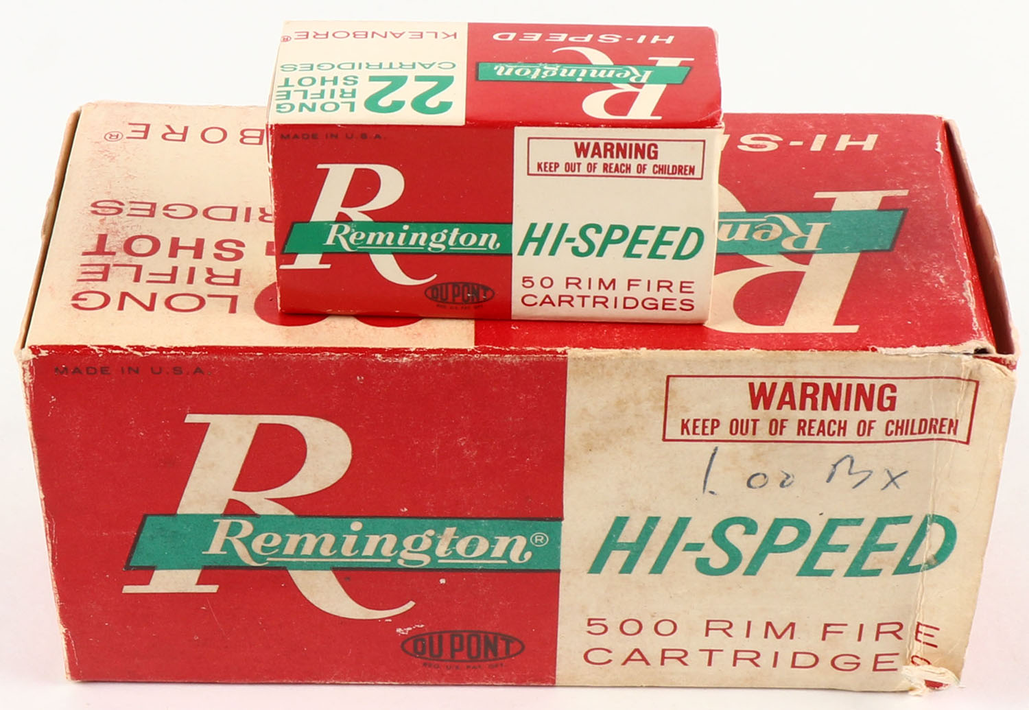 Remington, Hi-Speed Kleanbore, .22 Long Rifle Shot, Full, 500rds., 1pc. Red white & green brick, brick is solid with very good color, some age soiling & shelf wear, top has been written on, corner wear, minor edge wear, end flaps are solid, inside boxes are minty. Grade: Very Good ++ - Value: 80 to 240