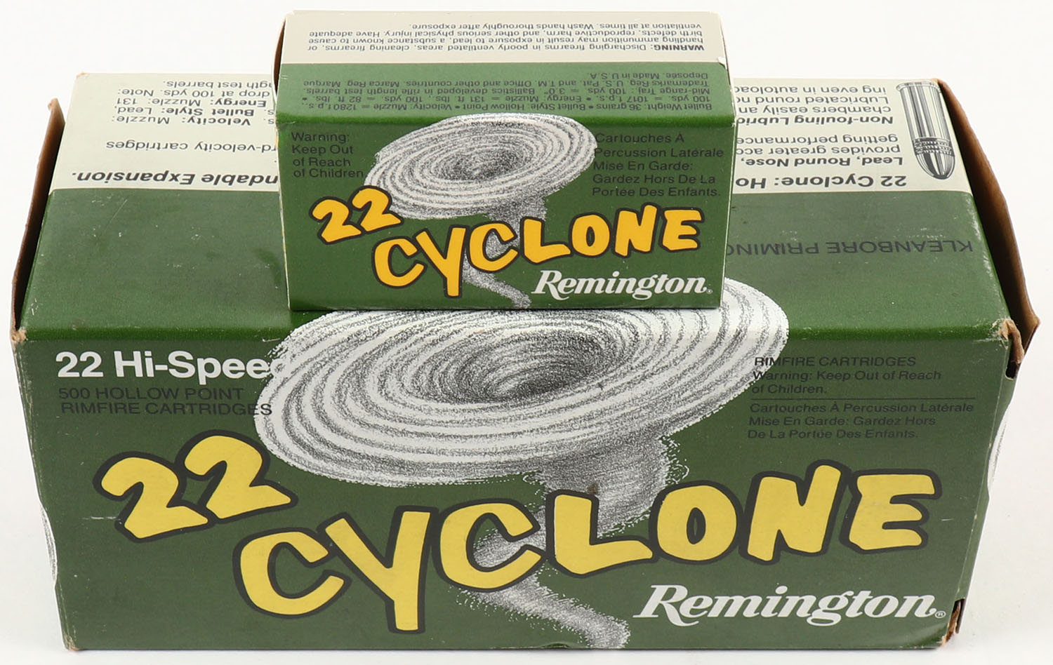 Remington, 22 Cyclone, .22 Long Rifle Hollow Point, Full, 500rds., 1pc. Green gray & yellow brick, brick is solid with excellent color, very minor shelf & corner wear, edges are mostly crisp, end flaps are solid, inside boxes are minty. Grade: Excellent + - Value: 30 to 90