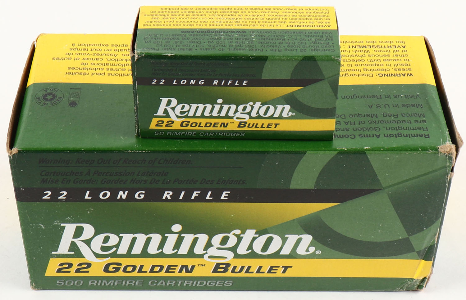 Remington, 22 Golden Bullet, .22 Long Rifle, High Velocity, Plated Round Nose, Full, 500rds., 1pc. Green & yellow brick, brick is solid with minty color, minor corner wear, edges are mostly crisp, end flaps are solid, inside boxes are minty. Grade: Excellent + - Value: 30 to 90